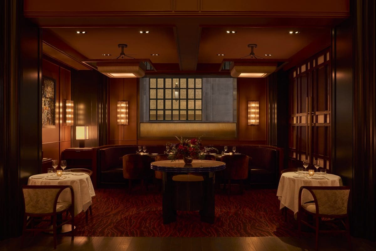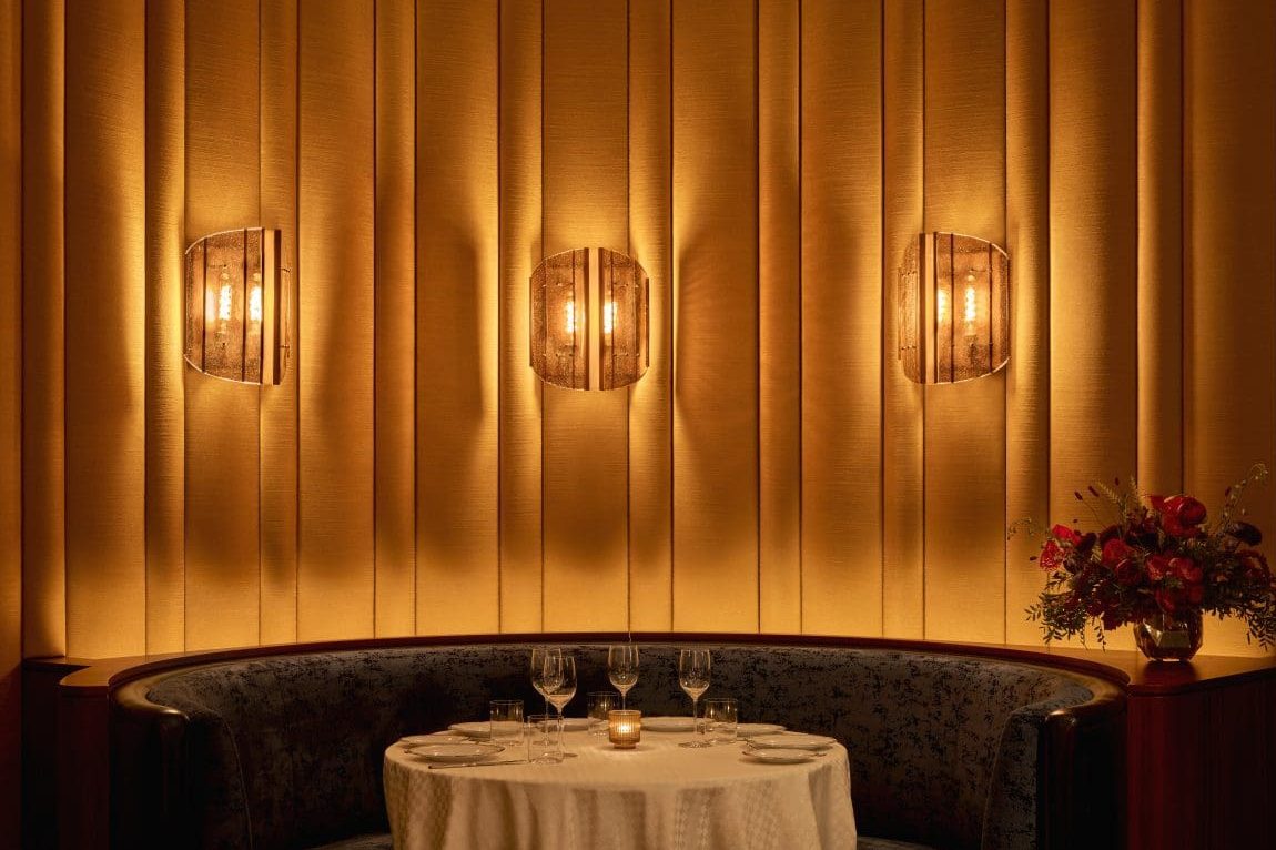 Rockwell Group’s design draws heavily from the Art Deco era. The restaurant features soaring 18-foot ceilings, seating for 120 guests, plush banquettes, and a curved bronze quartzite bar. Wood- and leather-clad walls, parquet flooring, imported Italian stone, and custom lighting further elevate the space. A metal art installation above the wood-burning grill adds a bold focal point.