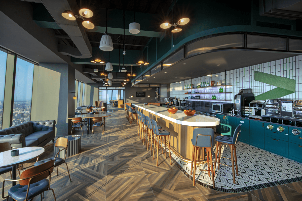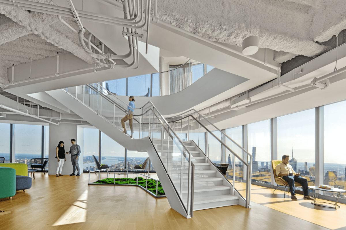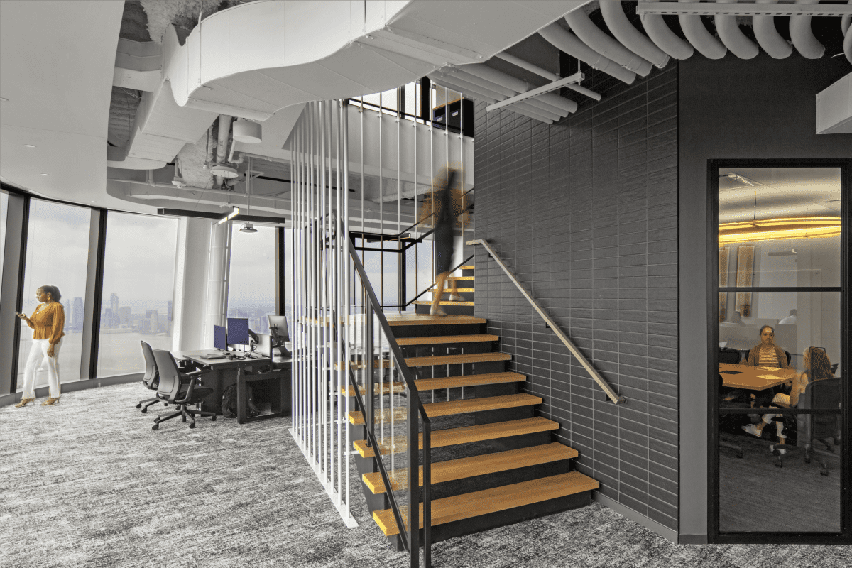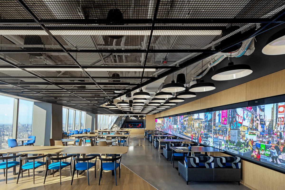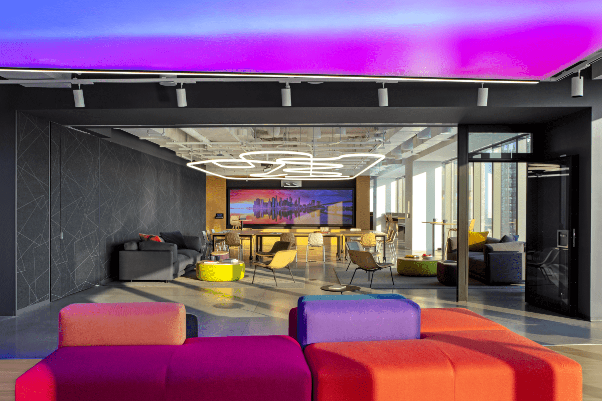 Dubbed the Innovation Hub, this amenity-rich space spans across 8 floors and houses 3,000 employees. At the top of the house, 2 floors are dedicated to a full cooking kitchen, conference center, executive suites, a boardroom, and Maker Lab. Additionally, POE technology is integrated throughout the entire space, allowing energy efficiency and flexibility as the business expands.