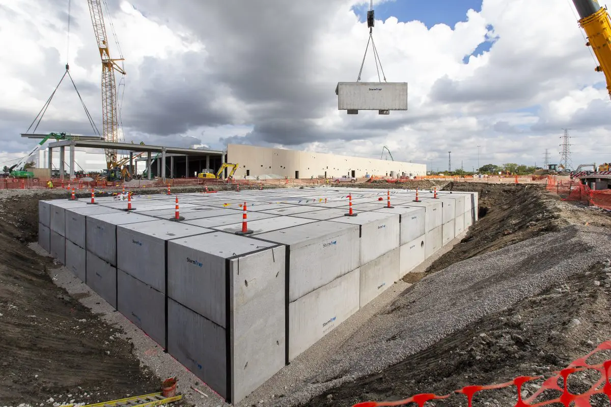 Ground-up 220,000 SF precast structure supported on 900 rammed aggregate piers. An exterior equipment yard houses the generators and containerized electrical gear. 36MW critical load. Data hall conditioning is achieved using air cooled chillers and high efficiency fanwall units. Stormwater management is comprised of an interconnected, underground vault (StormTrap) system containing three separate double-trap vaults providing 7.37 acre-feet of detention storage. The project will achieve three Green Globes.