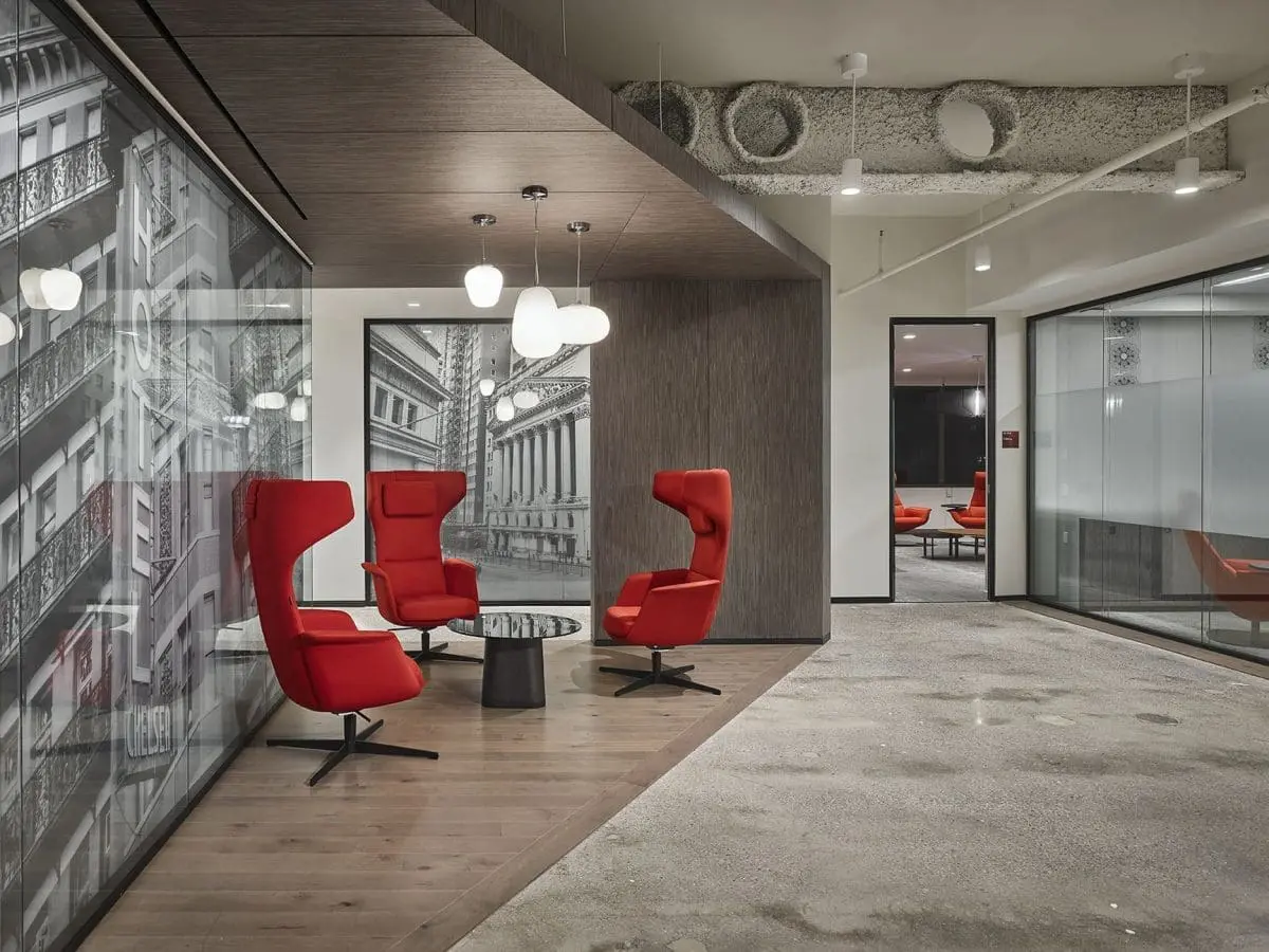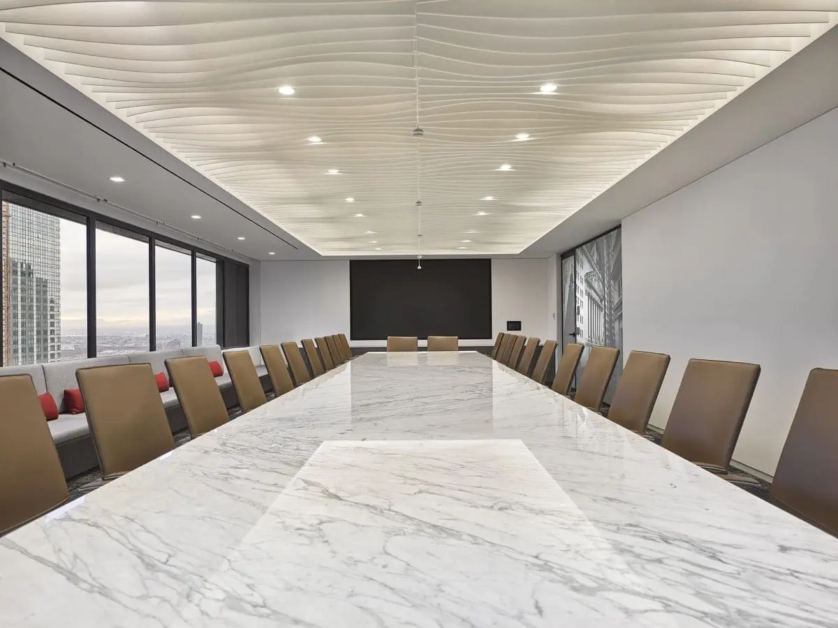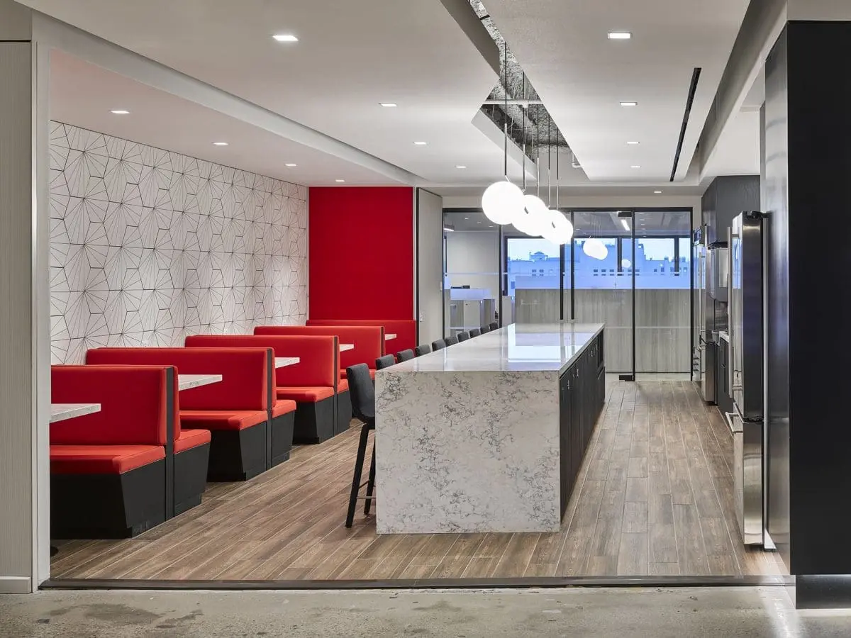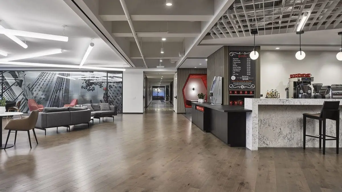 Built in four phases, this unique office fit-out was designed to promote employee engagement and collaboration. Spanning across 6 floors, the re-envisioned space boasts an array of amenities, including a state-of-the-art conference center, training facilities, strategically placed lounge areas and pantries on each floor, and seamlessly integrated open office workstations. StarSilent acoustic ceilings and custom lighting placed throughout the floors adds a contemporary touch to the space.