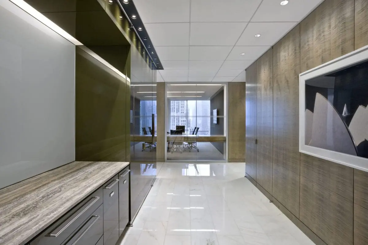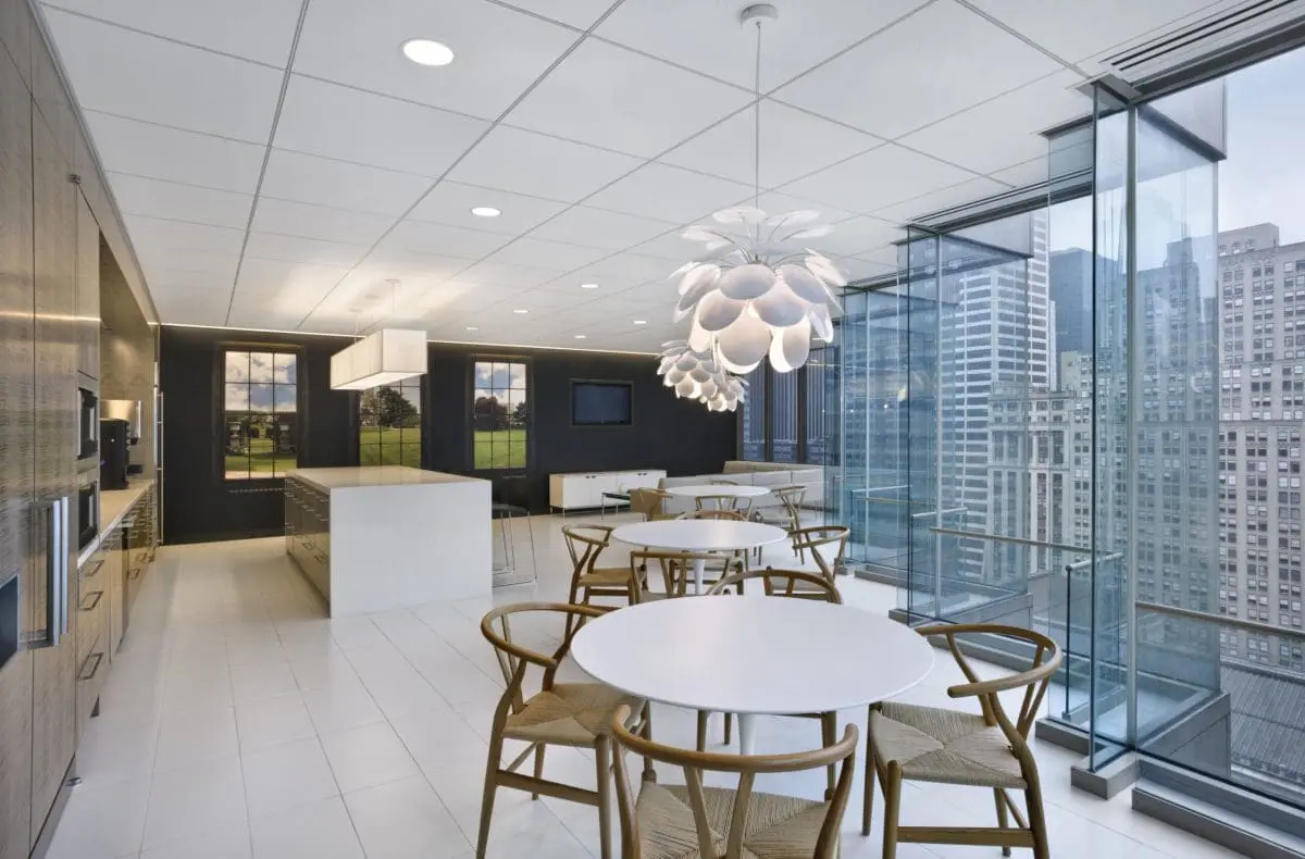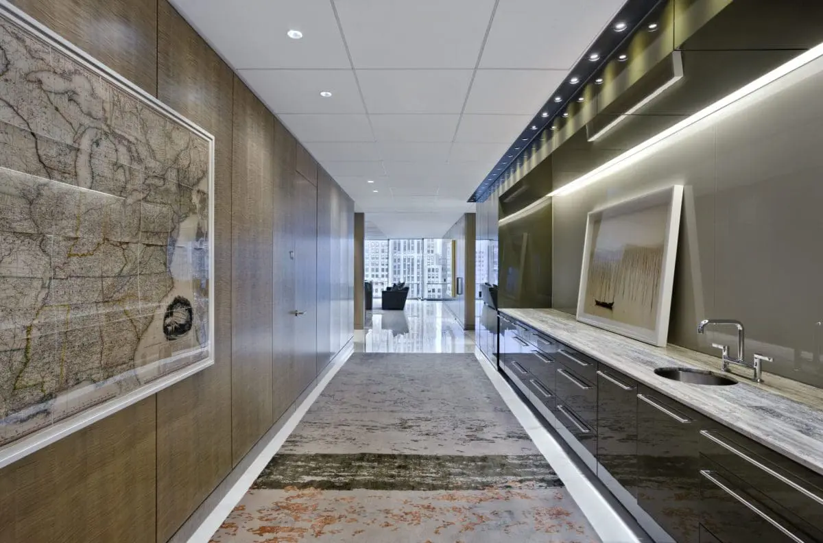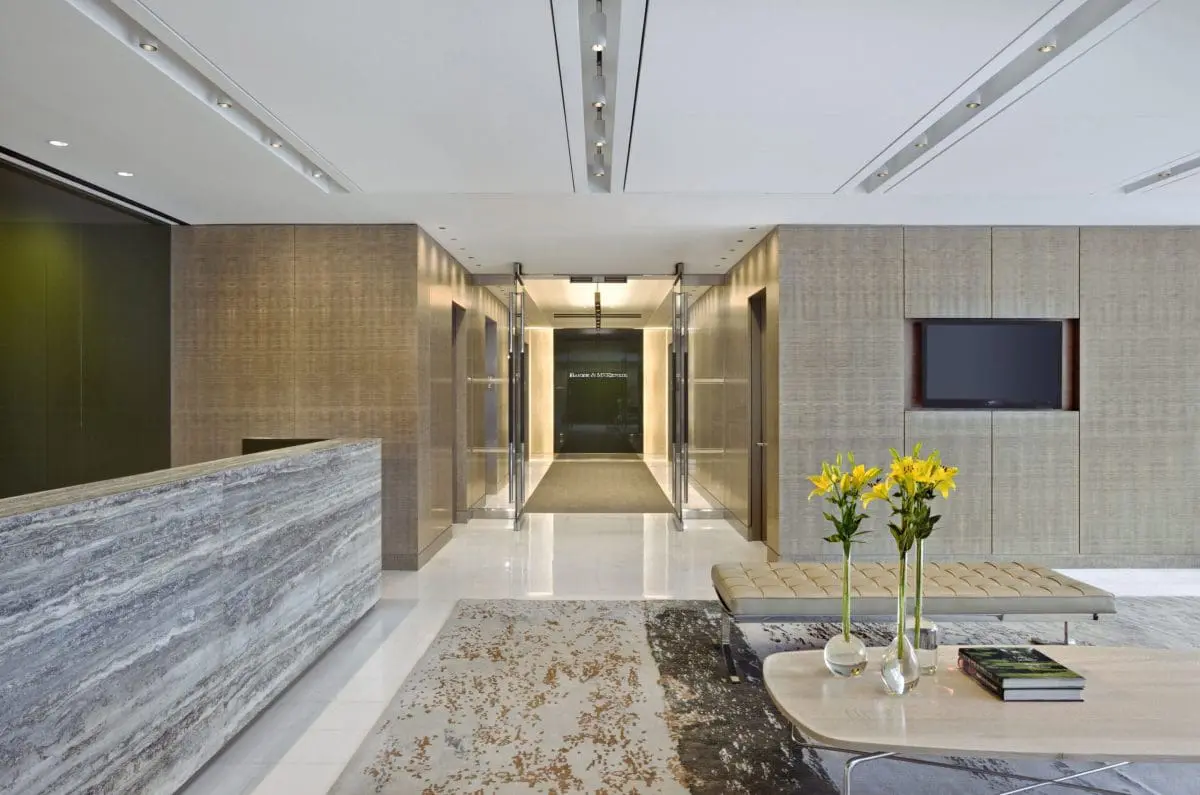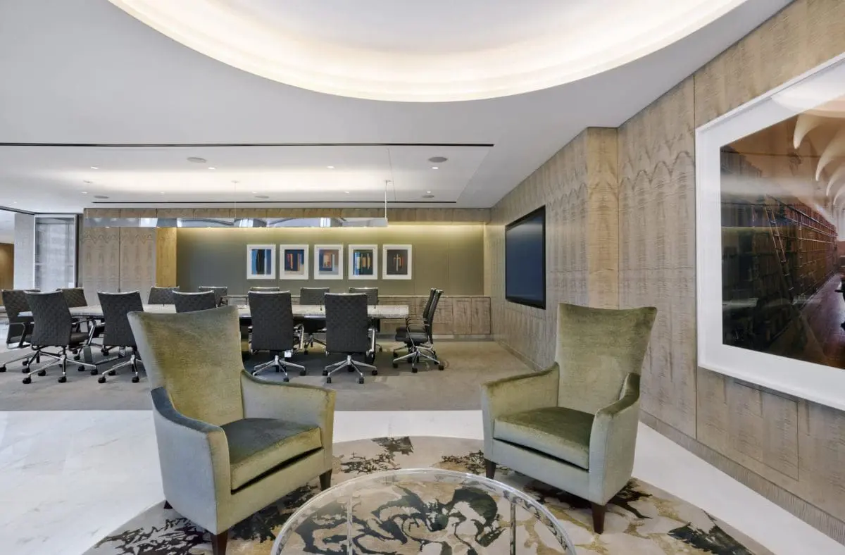 Located in the newly upgraded Fifth Avenue skyscraper, this interior fit-out for international law firm encompasses 125,000 square feet across 6 and a half floors. The design blends traditional stone with glass finishes for a clean, modern look, complemented by custom millwork throughout to create a warm, residential feel. The space includes dedicated attorney practice floors, a large conference center, a pantry, breakout areas for collaboration, new IDF & MDF rooms, and state-of-the-art AV systems integrated throughout.
