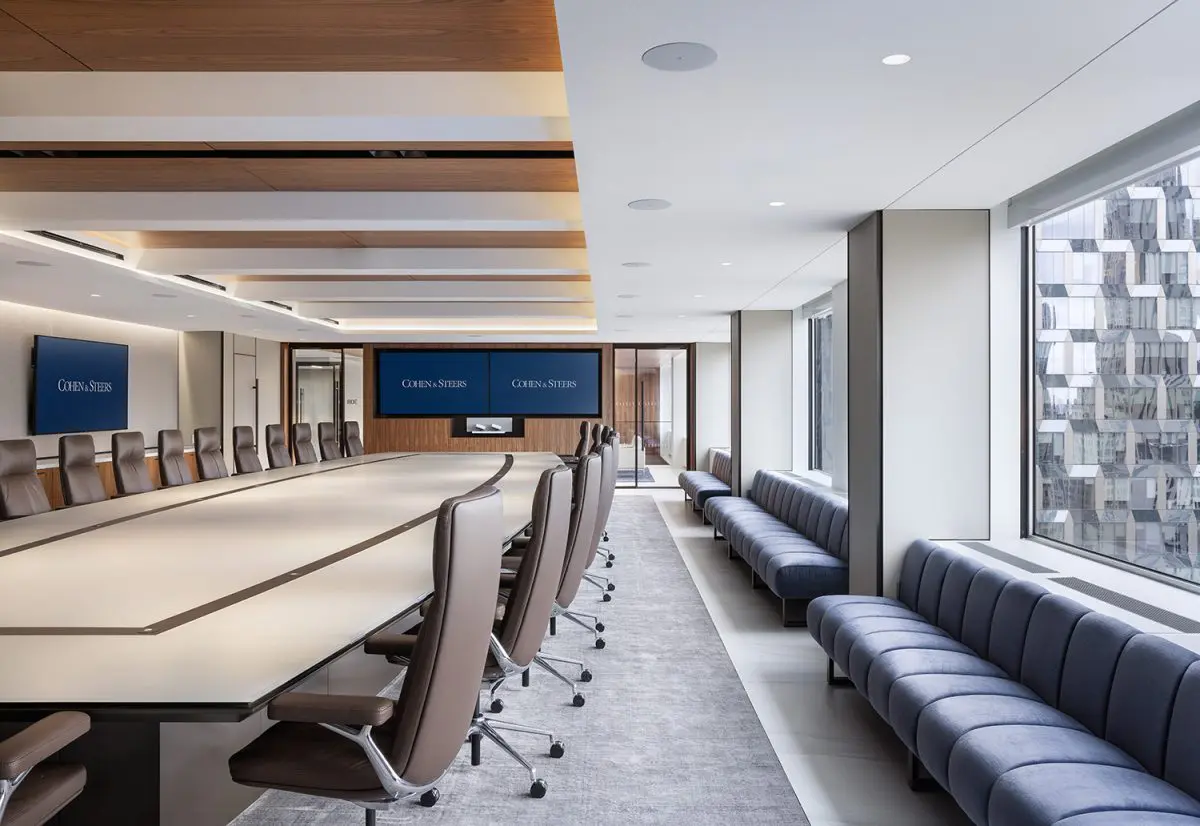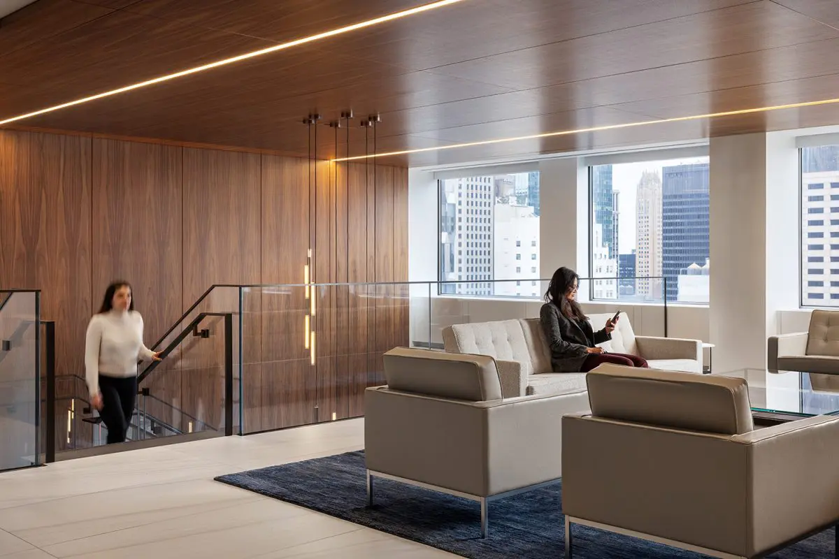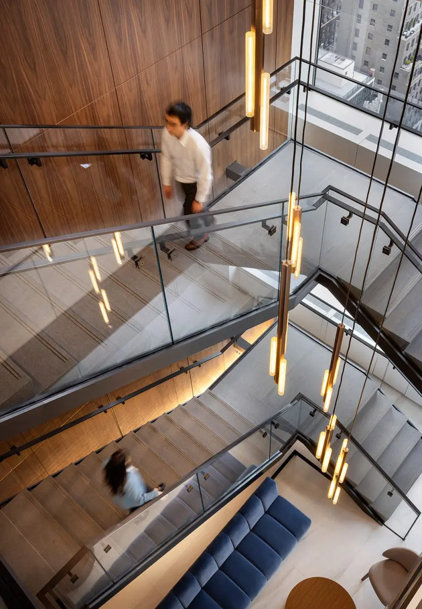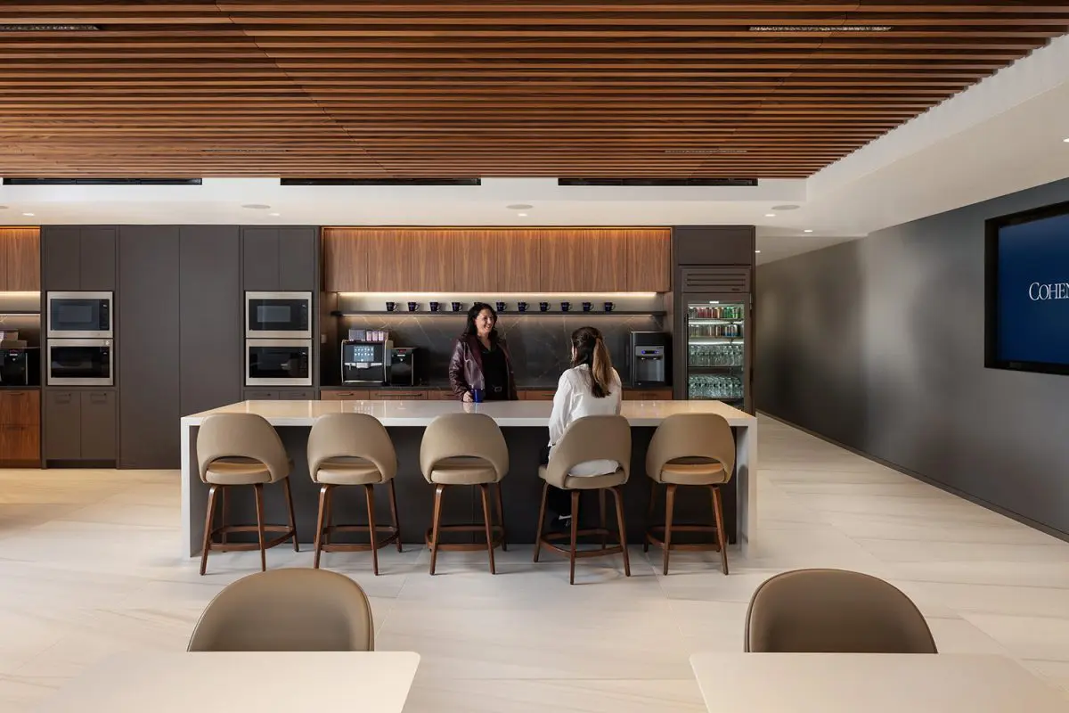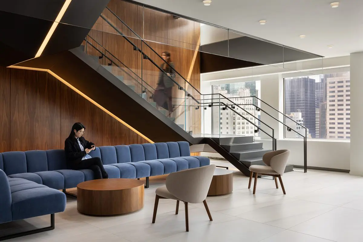 The re-imagination and remodel of Cohen & Steers’ 160,000 SF office at 1166 Avenue of the Americas transforms this four-floor workspace into a collaborative and talent-driven environment. A striking interconnecting staircase spans all four floors, featuring millwork paneling and custom lighting. Collaboration stations are integrated throughout, offering high-top work surfaces with advanced AV and connectivity, alongside casual lounge areas for relaxed meetings. A dedicated podcast room adds a creative space for content creation and communication. Designed with a classic and elegant style, the space is both sophisticated and functional. Achieving LEED Gold certification and a Fitwel 2 Star rating, this workplace prioritizes sustainability, wellness, and innovation.
