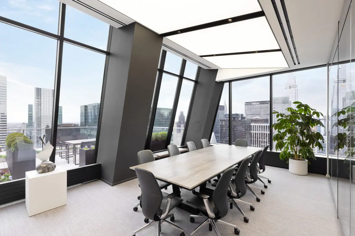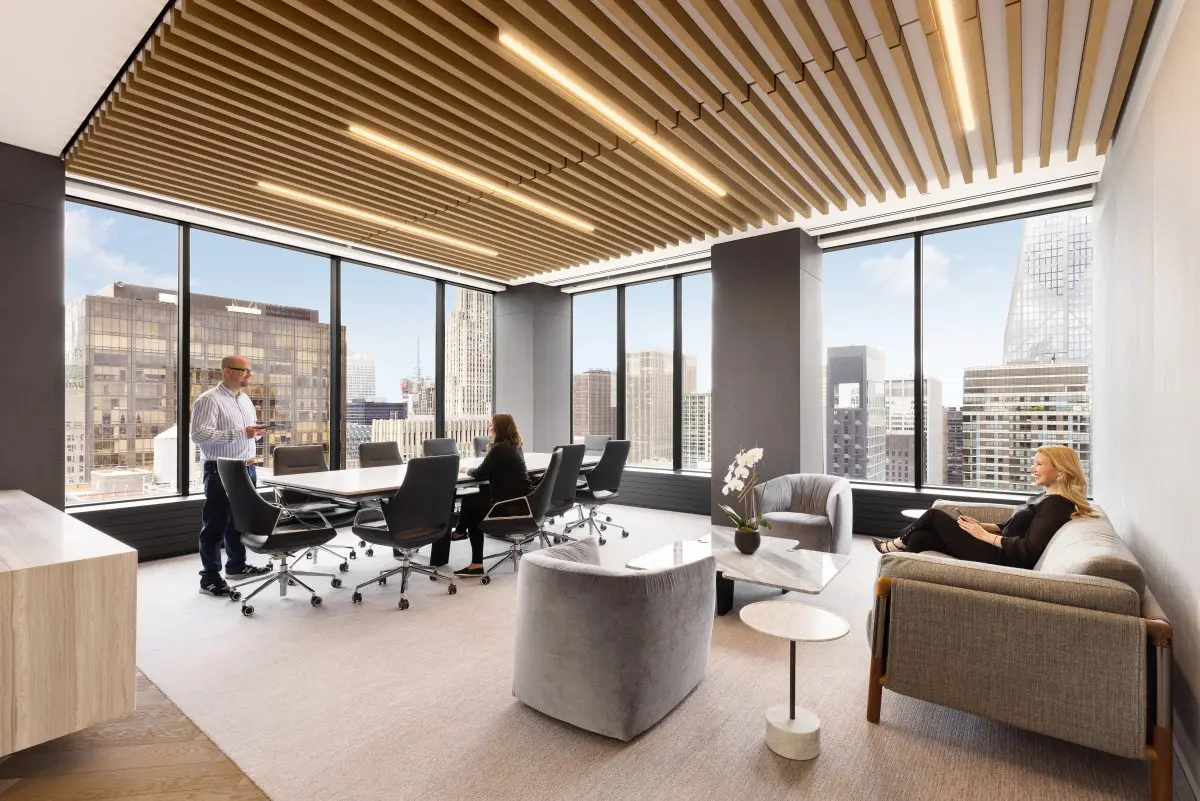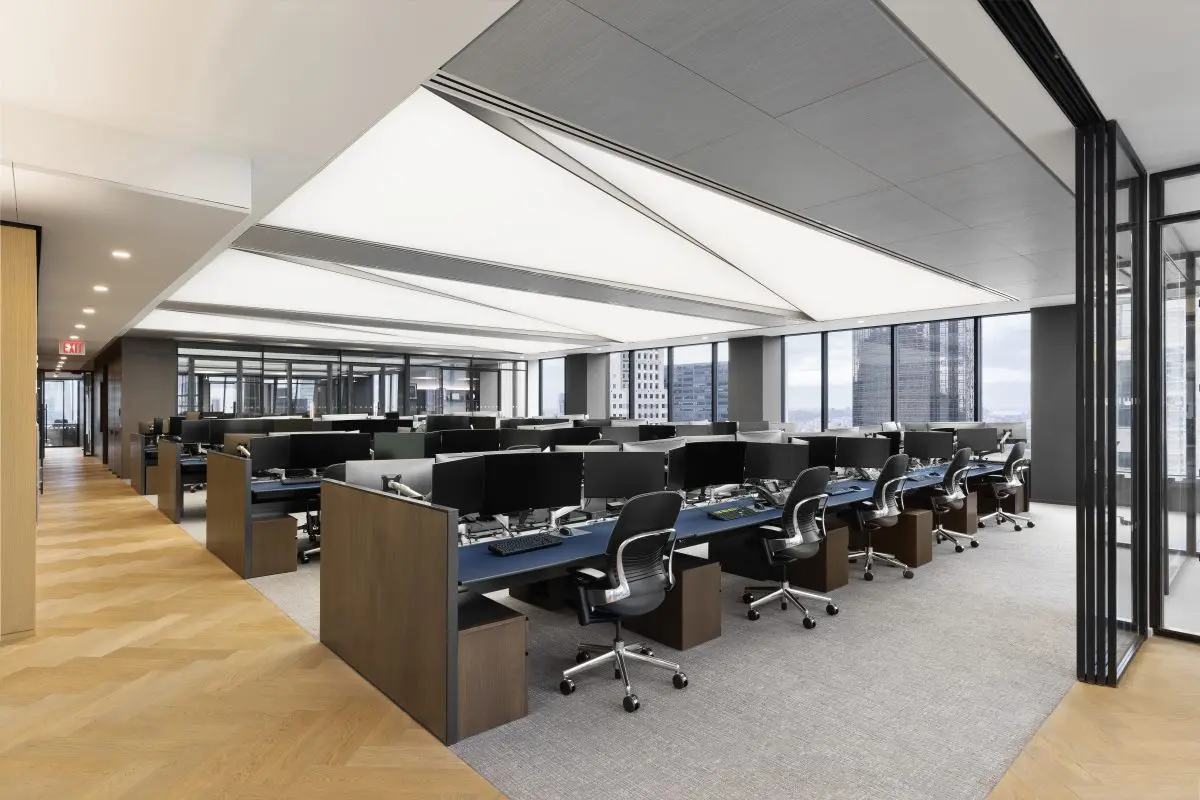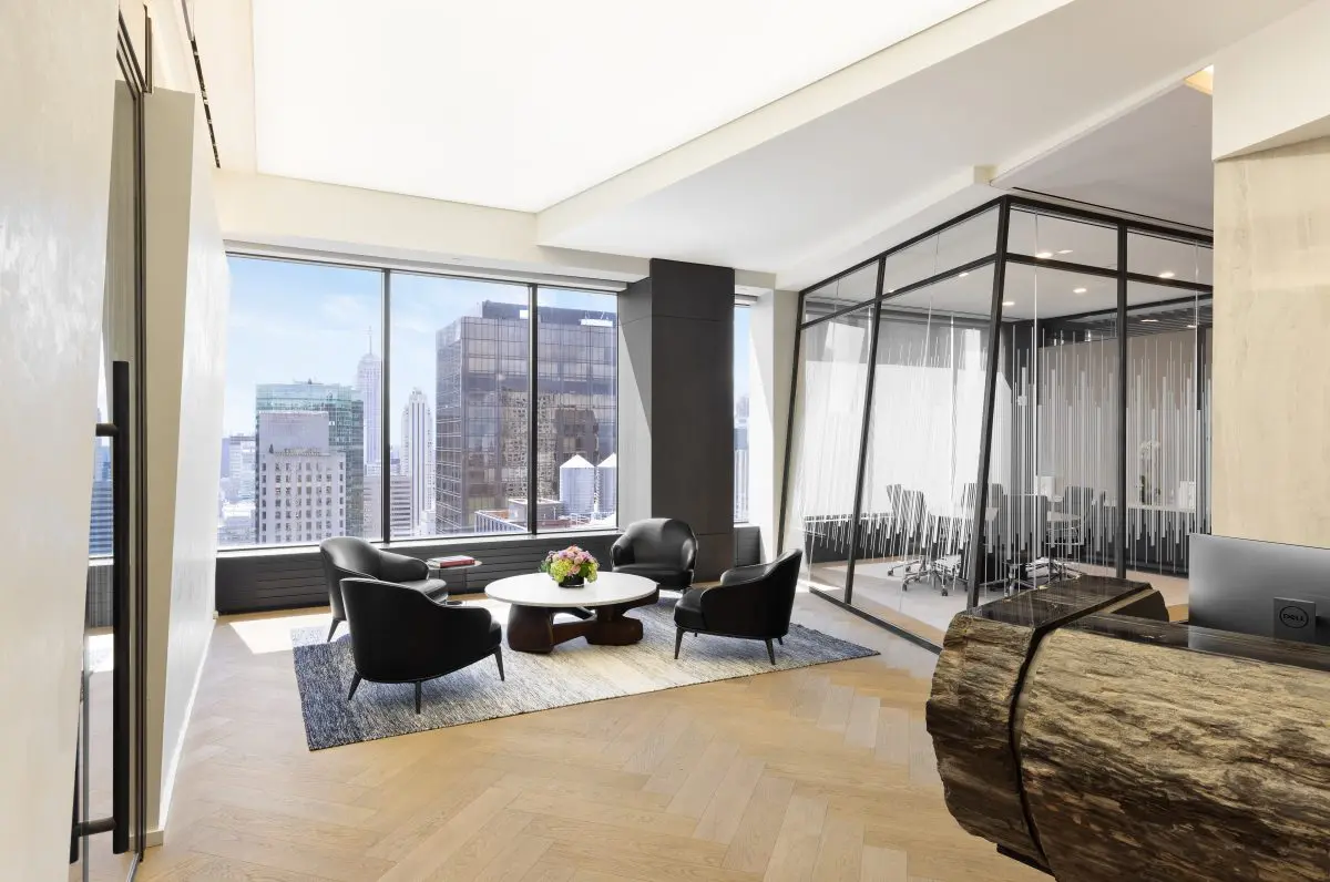 This interior fit-out for confidential financial service firm on Madison Avenue features a striking reception desk carved from a 25-million-year-old petrified Indonesian log, serving as the focal point of the space. Herringbone oak wood floors welcome guests at the elevator lobby and reception, while specialty wood baffle ceilings enhance the conference rooms and family offices. The trading floor is lined with glass office fronts, emphasizing transparency, and is complemented by meeting rooms and lounge spaces that provide flexibility with operable office fronts for optional privacy. Additionally, a large outdoor terrace offers wellness benefits to employees and stunning views of the city, creating an inviting and dynamic workplace.