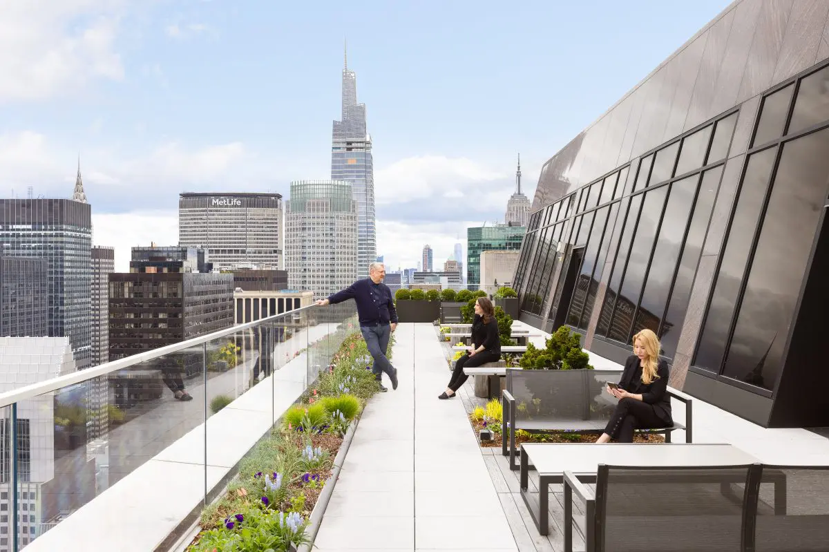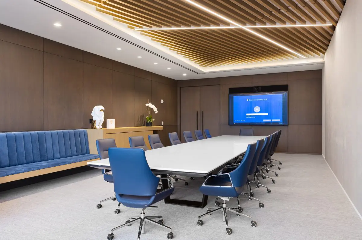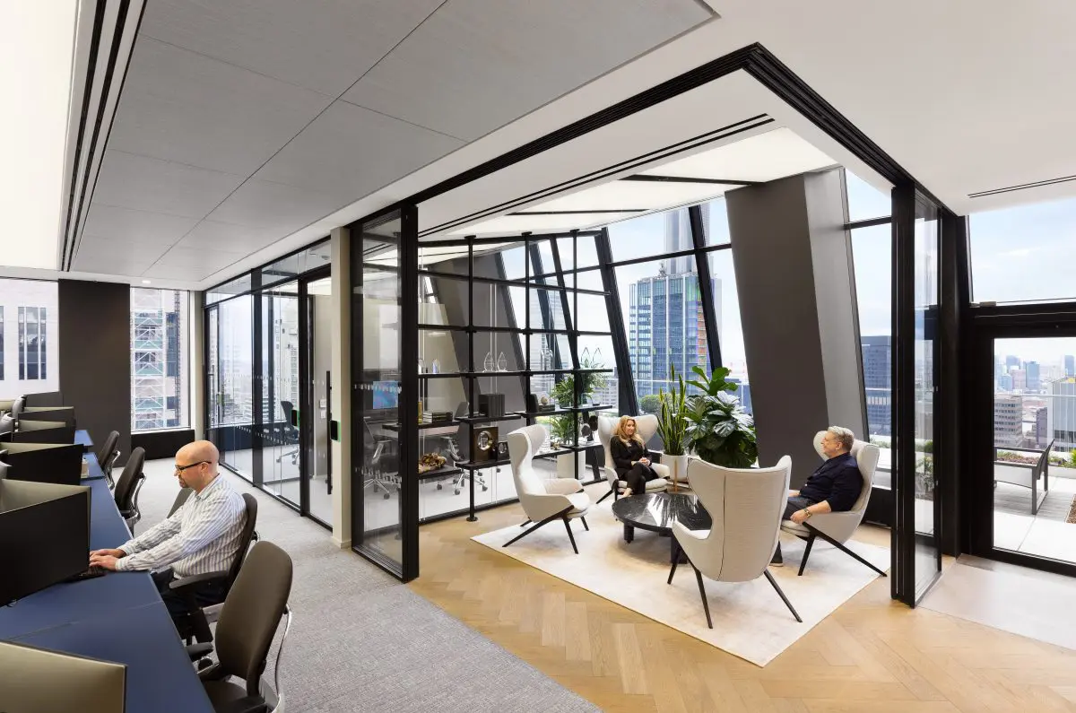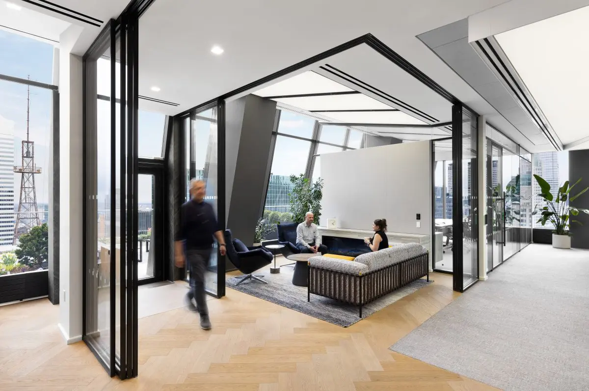 This interior fit-out for confidential financial service firm on Madison Avenue features a striking reception desk carved from a 25-million-year-old petrified Indonesian log, serving as the focal point of the space. Herringbone oak wood floors welcome guests at the elevator lobby and reception, while specialty wood baffle ceilings enhance the conference rooms and family offices. The trading floor is lined with glass office fronts, emphasizing transparency, and is complemented by meeting rooms and lounge spaces that provide flexibility with operable office fronts for optional privacy. Additionally, a large outdoor terrace offers wellness benefits to employees and stunning views of the city, creating an inviting and dynamic workplace.