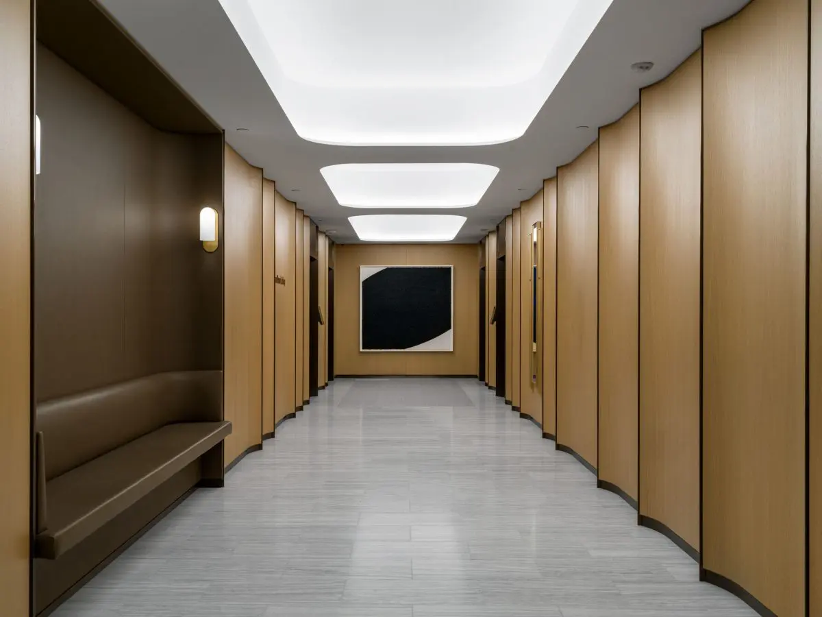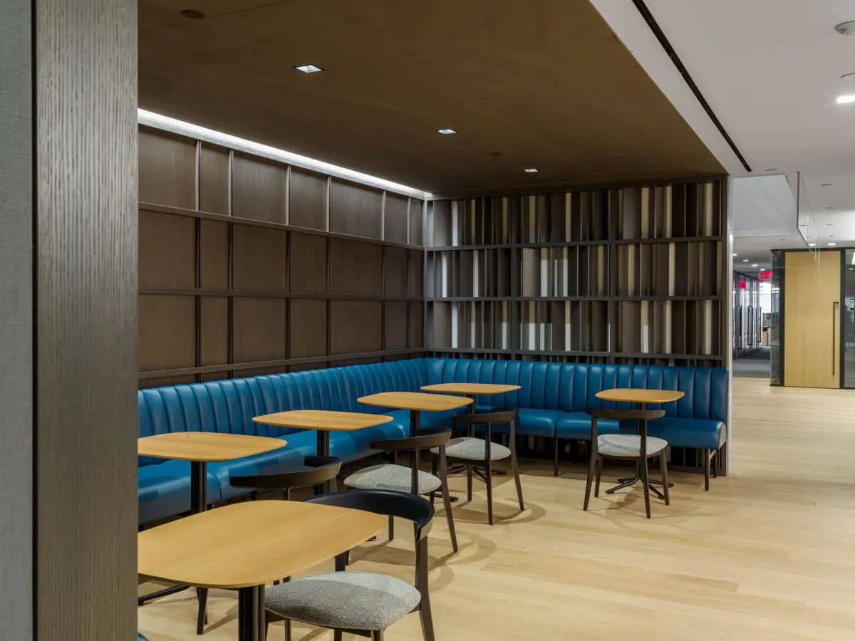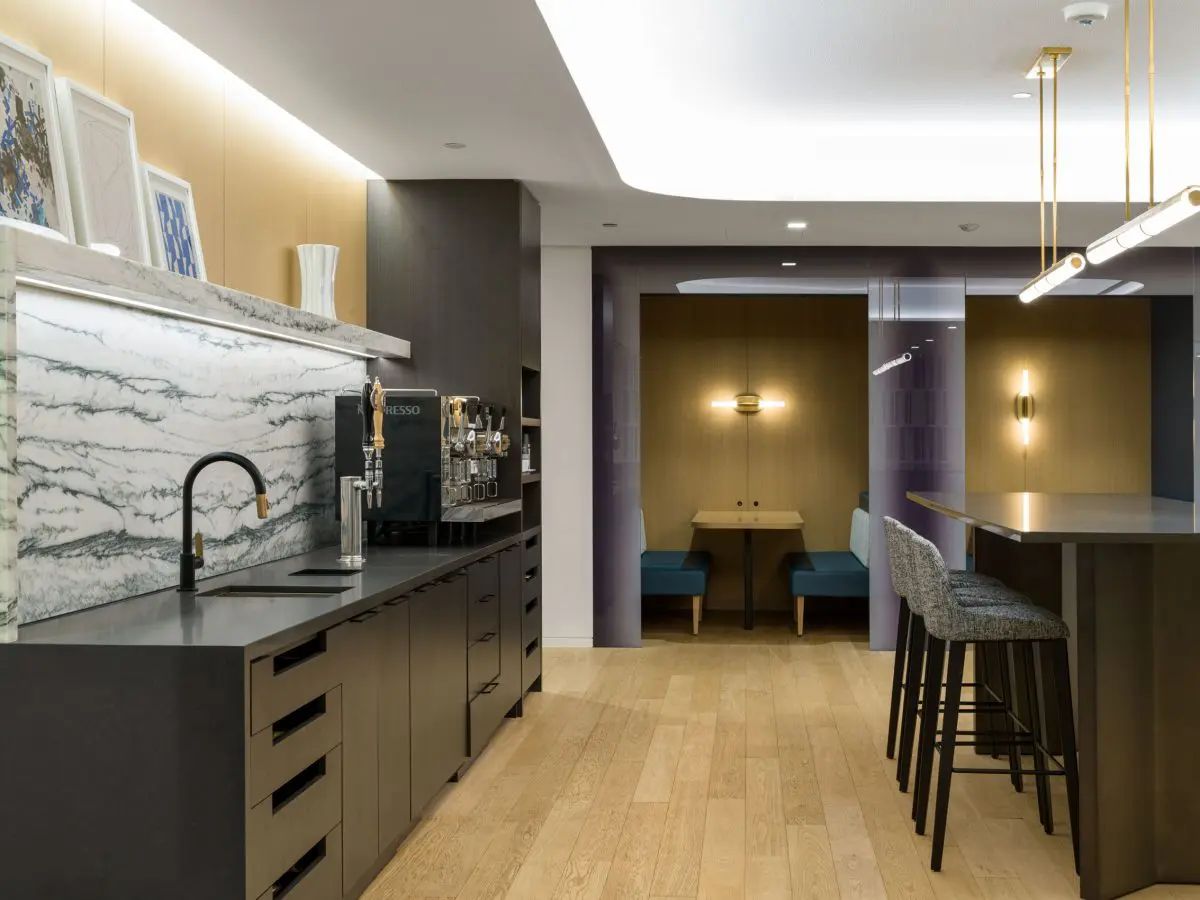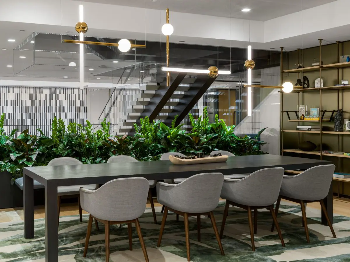 Located at 245 Park Avenue, this 5-floor fit-out for the confidential investment company showcases a blend of modern design and functionality. A striking Design Assist staircase connects all five floors, enhancing flow throughout the space. The layout includes open workstations, small and large meeting rooms, and a full conference center, all equipped with cutting-edge technology. A top-tier catering pantry and café, featuring a marble backsplash, adds a touch of luxury, while partition walls define the open floor plan. Greenery woven into the lounge areas complements the warm wooden finishes, creating a balanced environment for both productivity and relaxation.