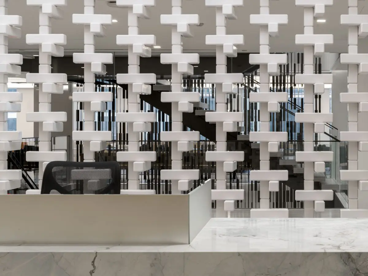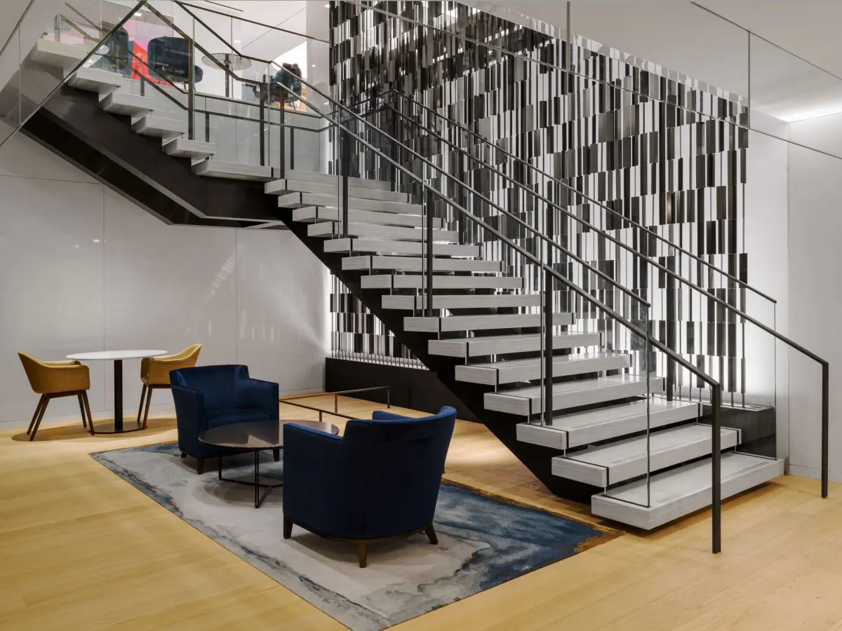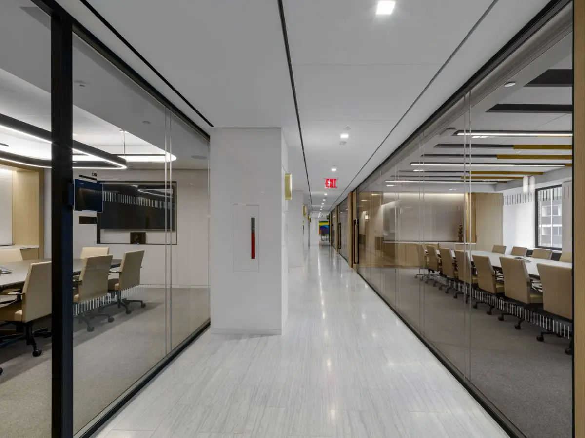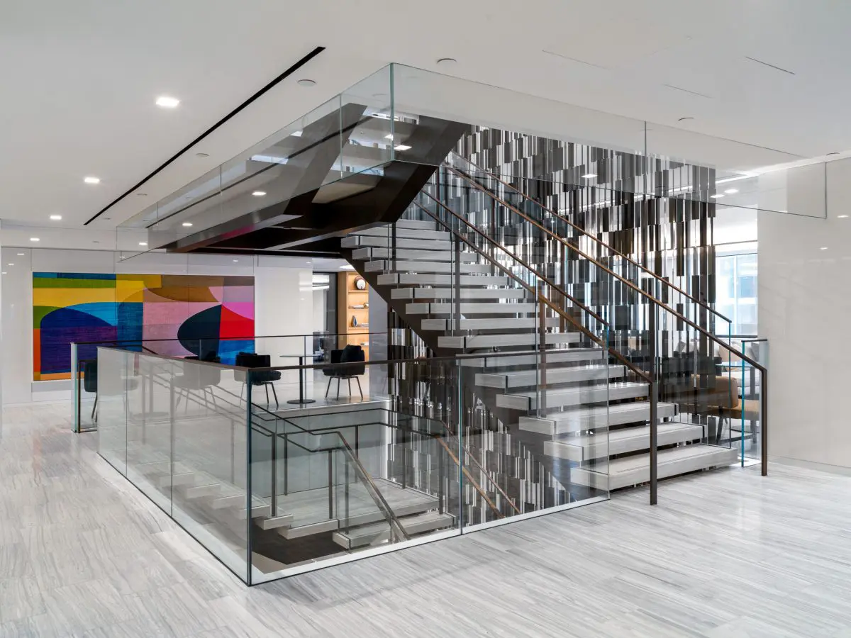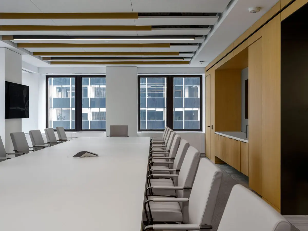 Located at 245 Park Avenue, this 5-floor fit-out for the confidential investment company showcases a blend of modern design and functionality. A striking Design Assist staircase connects all five floors, enhancing flow throughout the space. The layout includes open workstations, small and large meeting rooms, and a full conference center, all equipped with cutting-edge technology. A top-tier catering pantry and café, featuring a marble backsplash, adds a touch of luxury, while partition walls define the open floor plan. Greenery woven into the lounge areas complements the warm wooden finishes, creating a balanced environment for both productivity and relaxation.