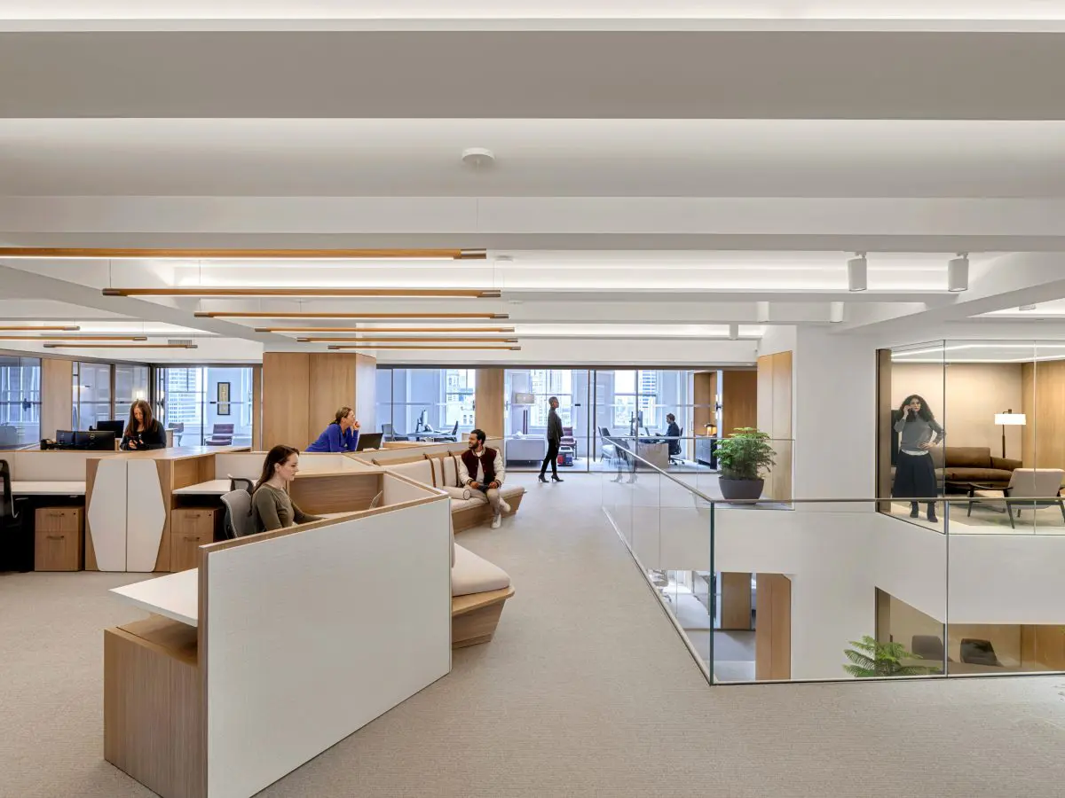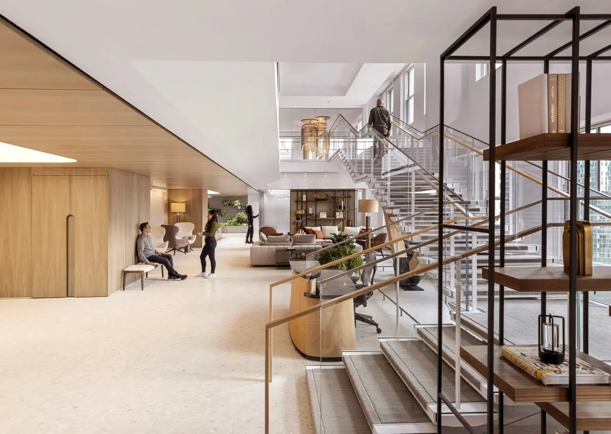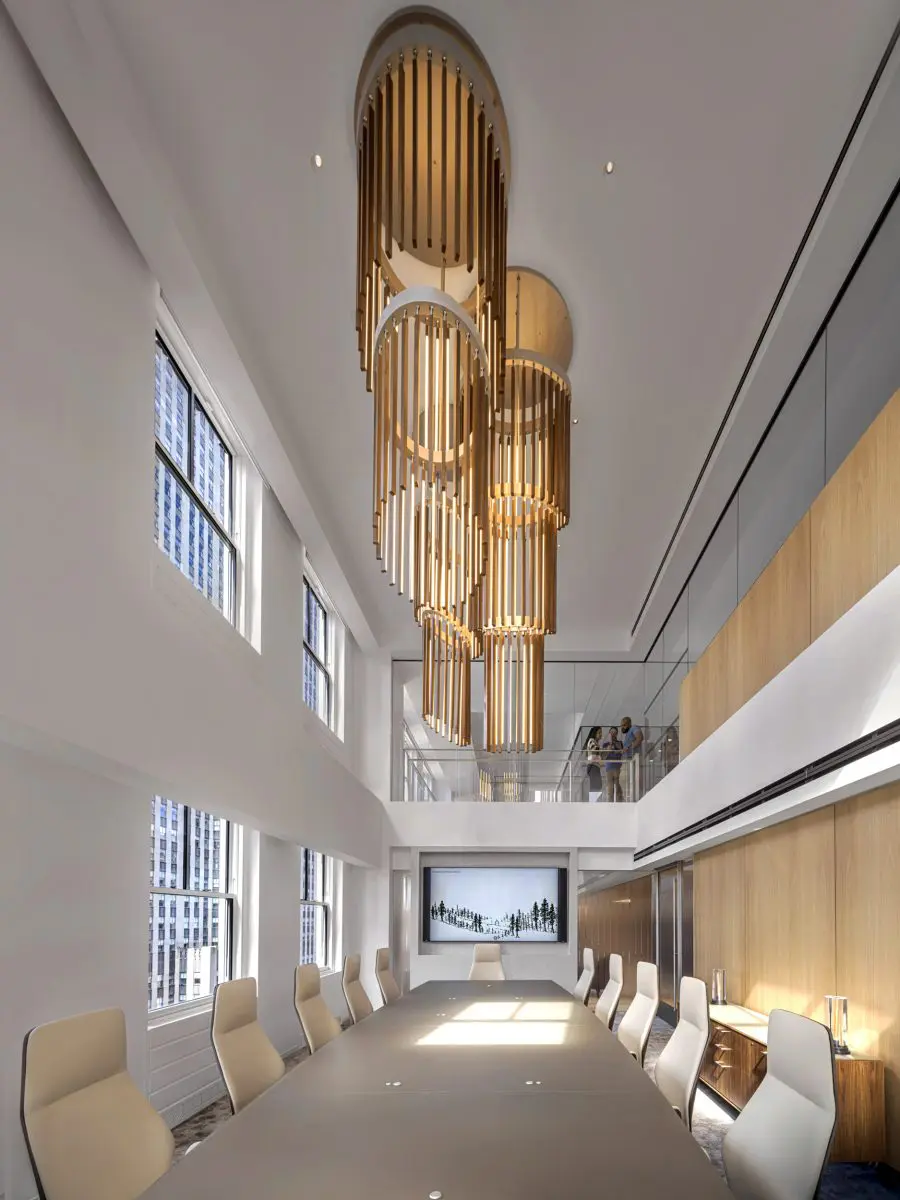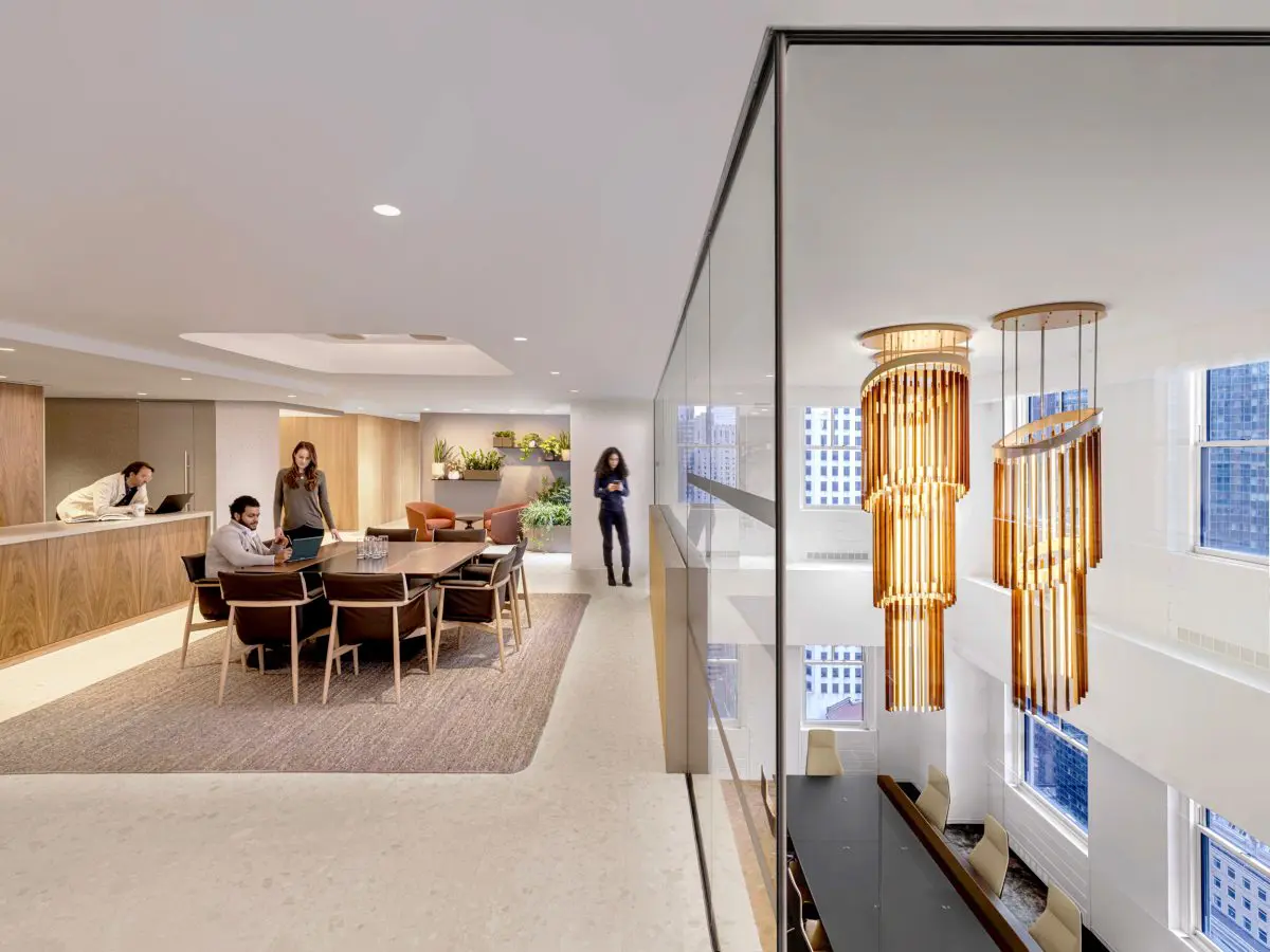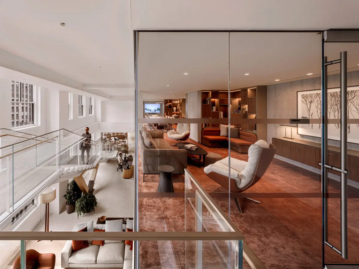 This two-floor fit-out for a confidential investment firm in Rockefeller Plaza offers a bright, modern workspace designed for collaboration and flexibility. The reception area features a neutral palette with extensive glass, maximizing natural light. A design-build staircase connects both floors, leading to a double-height conference room with feature lighting, a library that doubles as a conference room, and a boardroom. Workstations, private offices, informal breakout zones, a fitness center, and a pantry/café enhance functionality and employee well-being. Recognized with a Merit Award in the 2024 SARA National Design Awards and the 2024 Best of Year Award in the Small Financial Office Category from Interior Design Magazine, this space seamlessly blends sophistication with practicality.