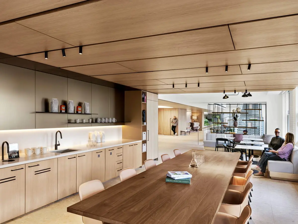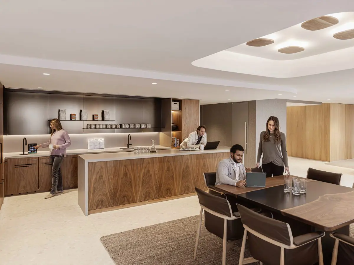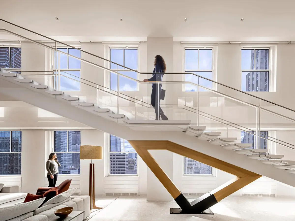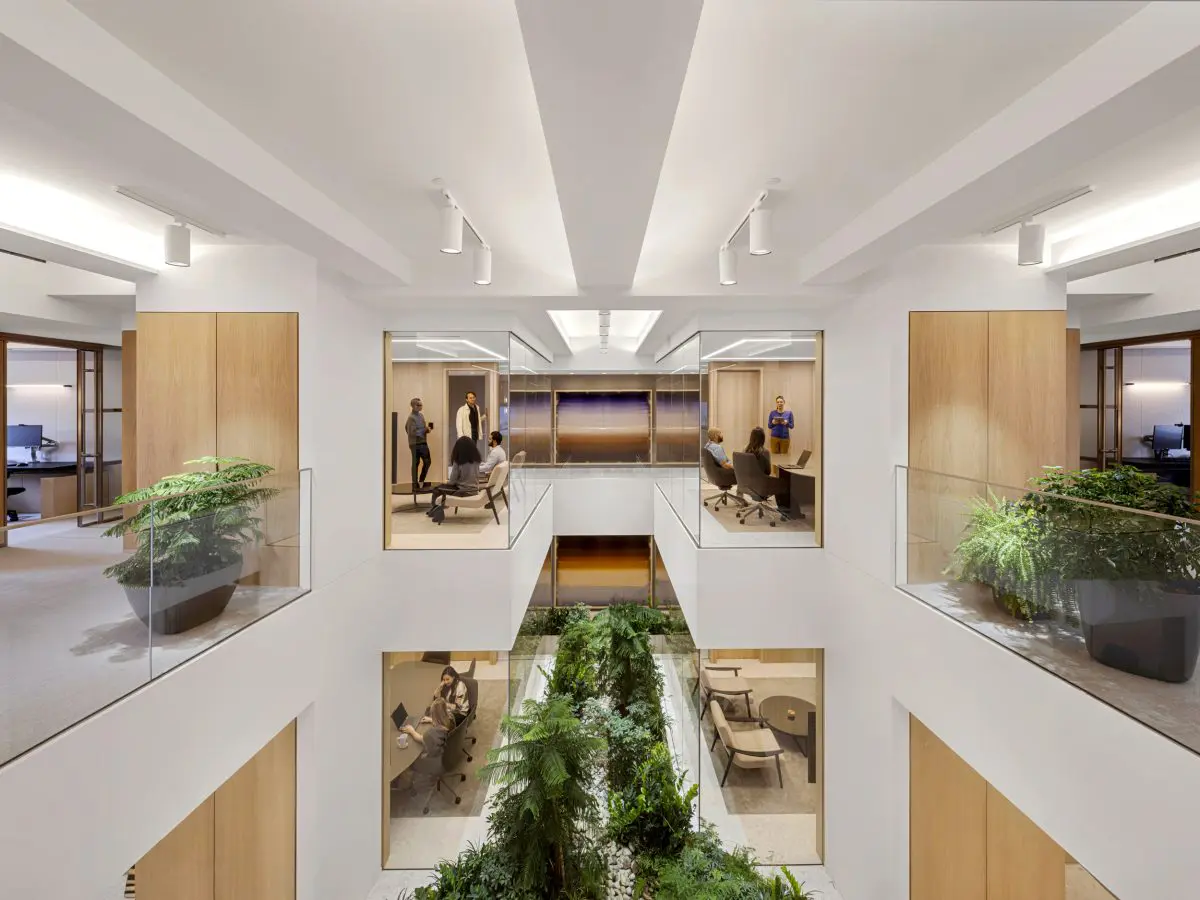 This two-floor fit-out for a confidential investment firm in Rockefeller Plaza offers a bright, modern workspace designed for collaboration and flexibility. The reception area features a neutral palette with extensive glass, maximizing natural light. A design-build staircase connects both floors, leading to a double-height conference room with feature lighting, a library that doubles as a conference room, and a boardroom. Workstations, private offices, informal breakout zones, a fitness center, and a pantry/café enhance functionality and employee well-being. Recognized with a Merit Award in the 2024 SARA National Design Awards and the 2024 Best of Year Award in the Small Financial Office Category from Interior Design Magazine, this space seamlessly blends sophistication with practicality.
