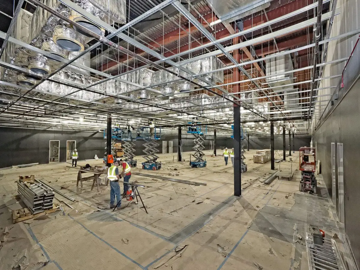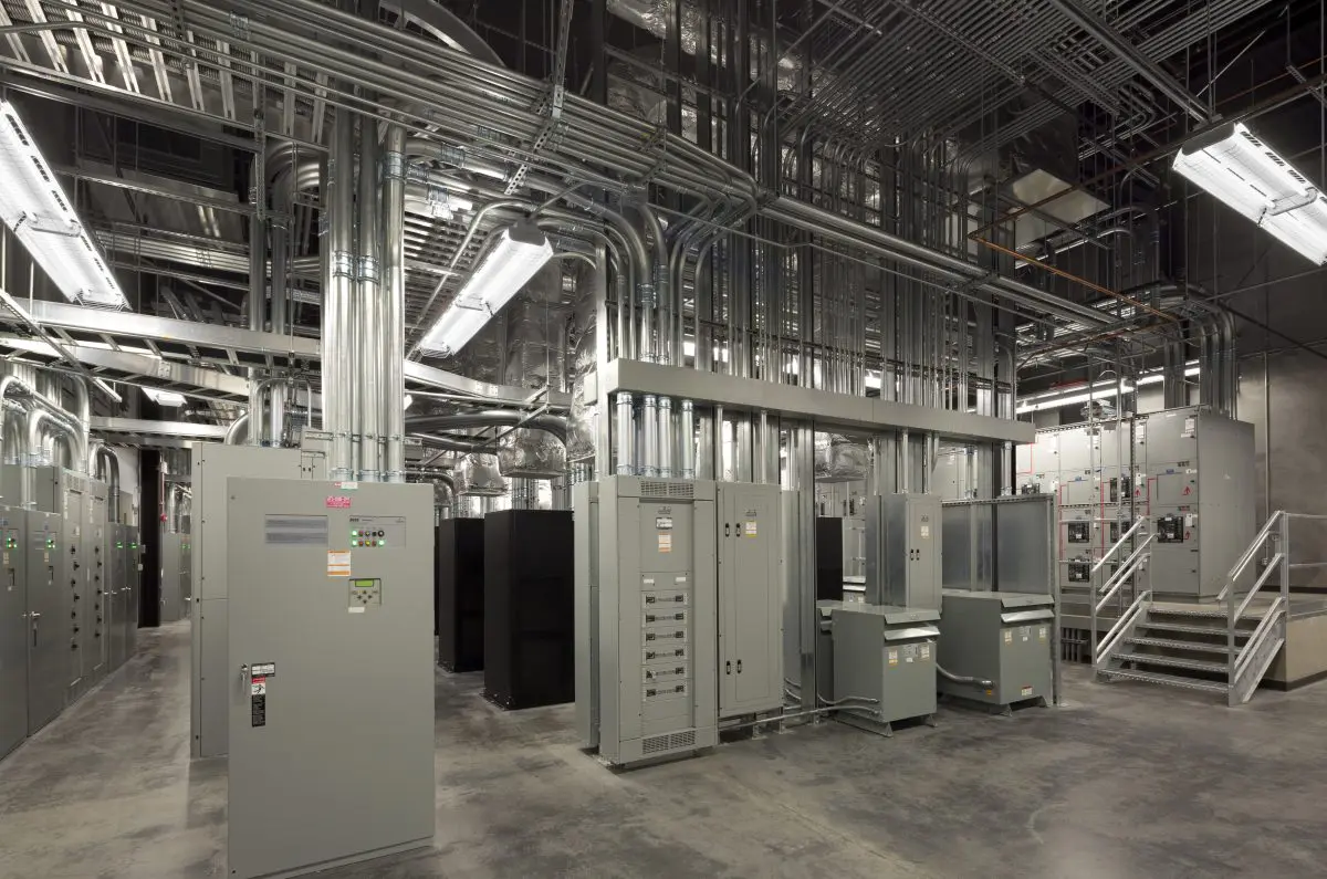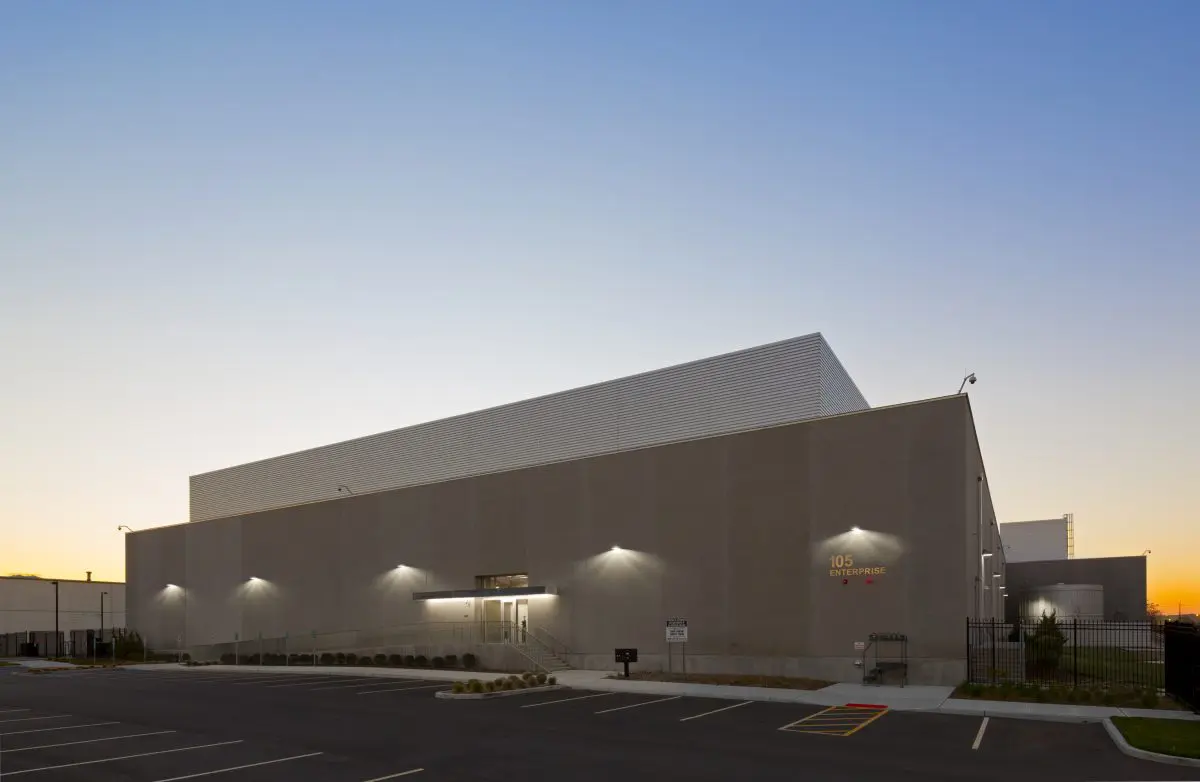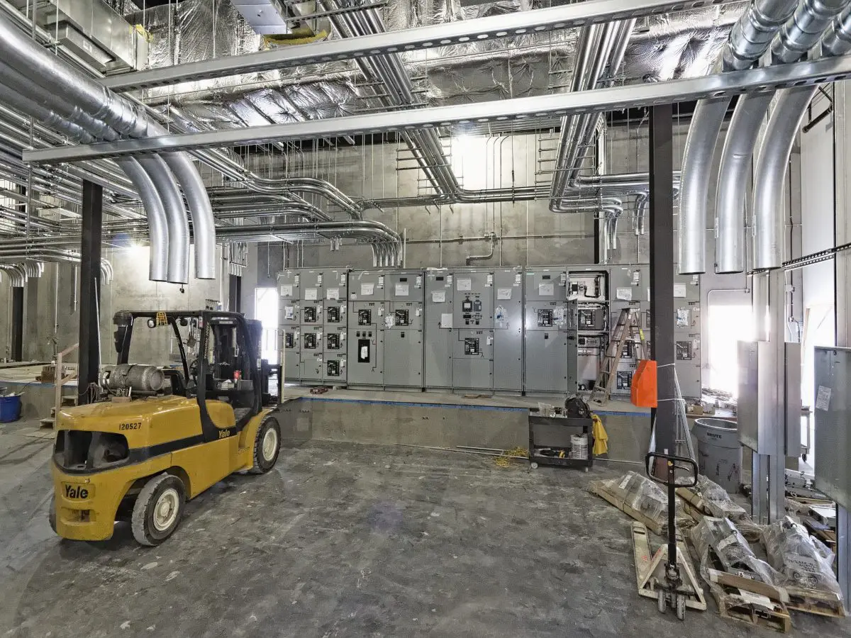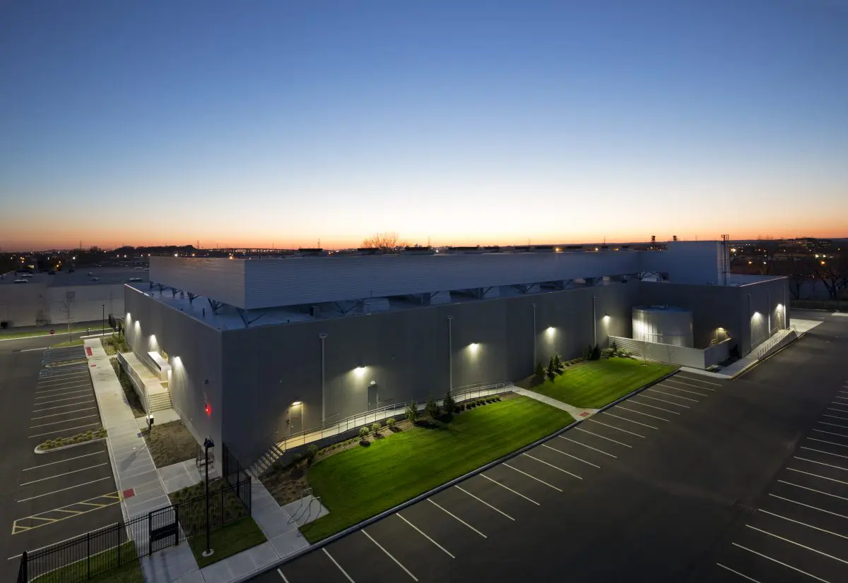 Multiple layers of security and safety are present in the form of man traps and locked doors with biometric fingerprinting technology. The construction site required demolition of an old building and grading the earth in preparation for the steel structure on a poured concrete slab. This business suites facility is designed to bridge the gap between retail and wholesale colocation by providing large, 300+ kVA footprints.