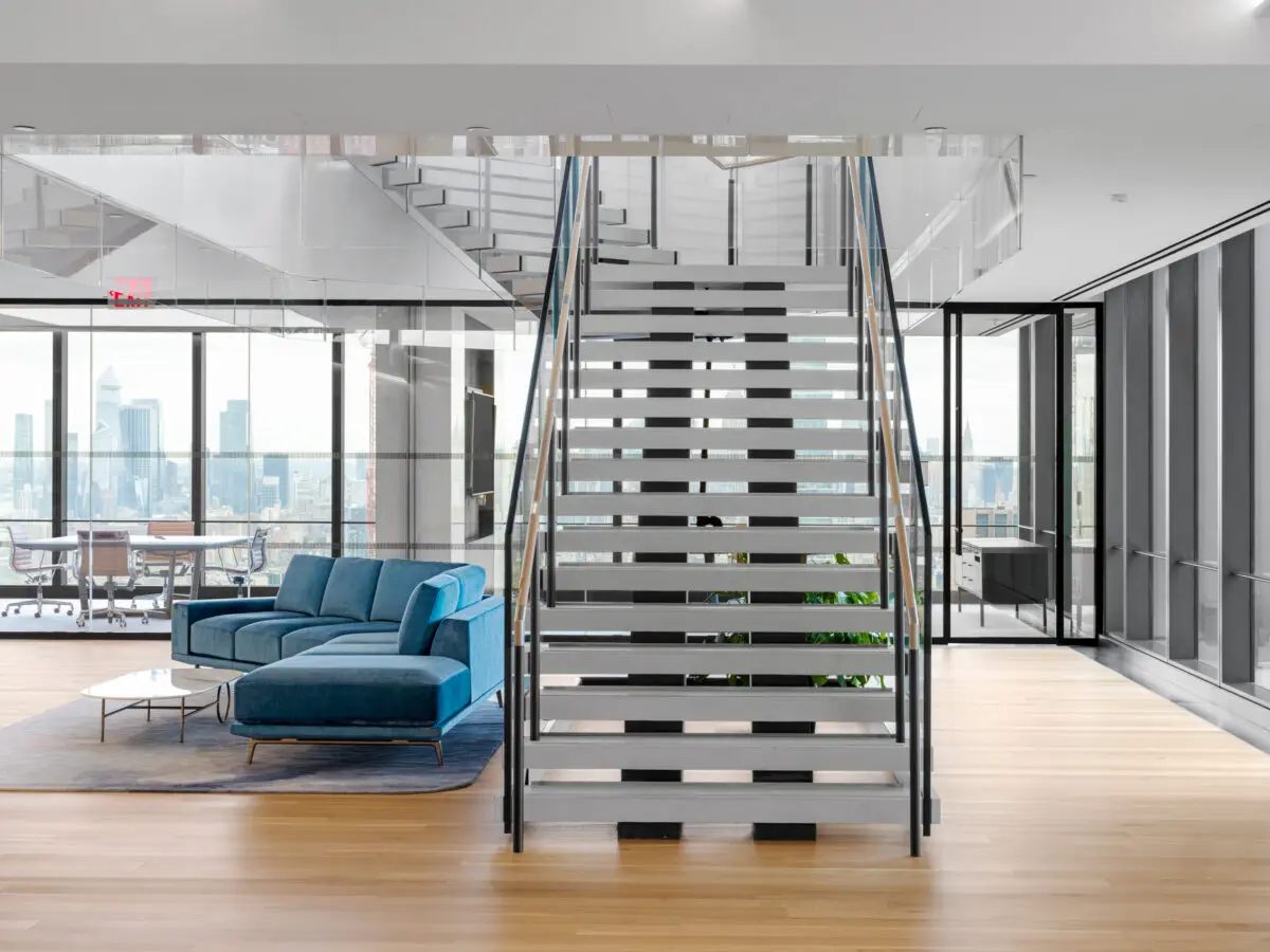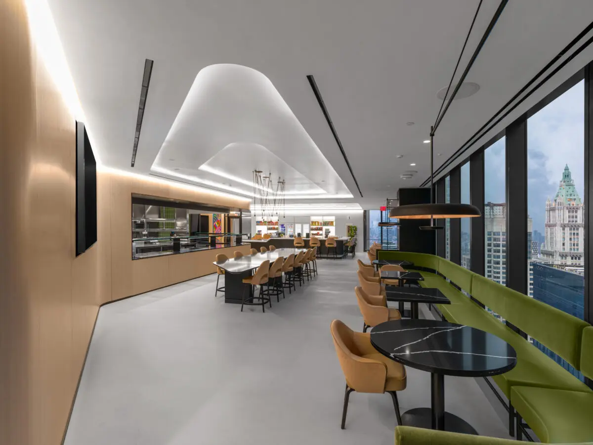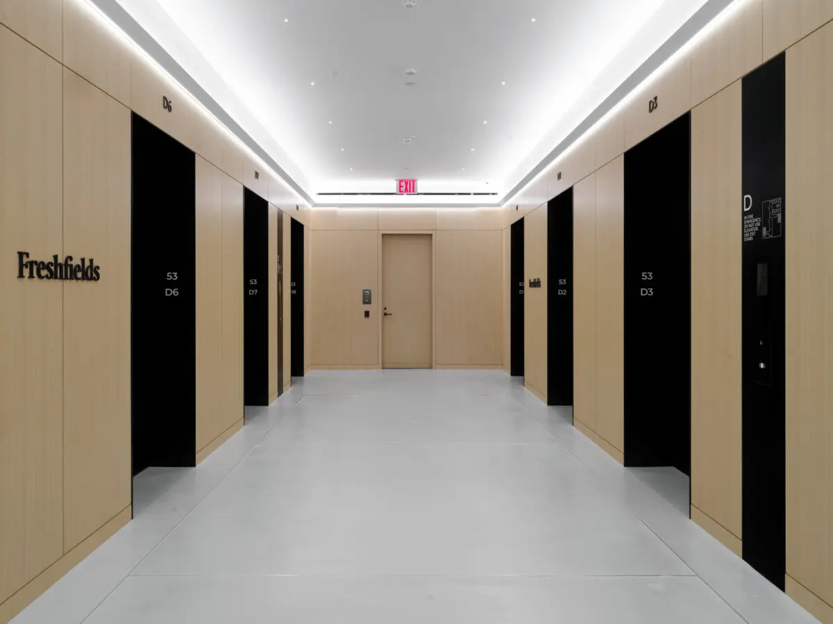 Freshfields Bruckhaus Deringer’s new 180,000 SF office at 3 World Trade Center spans four floors and reflects a modern evolution in legal workplace design. The space balances transparency and privacy with glass-front private offices, state-of-the-art acoustic wall systems, and light-filled interiors that maximize views of the Brooklyn Bridge and Lower Manhattan skyline. Designed to foster collaboration and connection, the office features hub pantries on each floor, a full-service café with Grab & Go and barista station, and multiple breakout and meeting spaces. Three architecturally striking interconnecting staircases clad in decorative precast concrete with wood handrails and glass guardrails anchor the workplace, creating dramatic focal points and enhancing movement between floors. High-end finishes, including poured Laticrete NXT concrete flooring, acoustical wall fabric panels, and stone and ceramic tile throughout, contribute to a refined, amenity-rich environment tailored to the needs of today’s legal professionals.