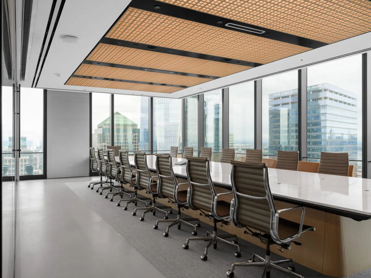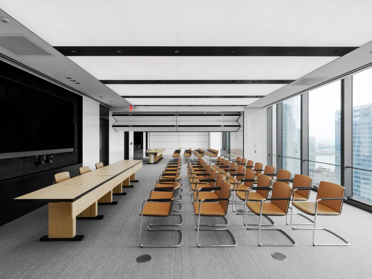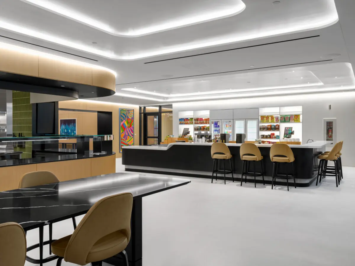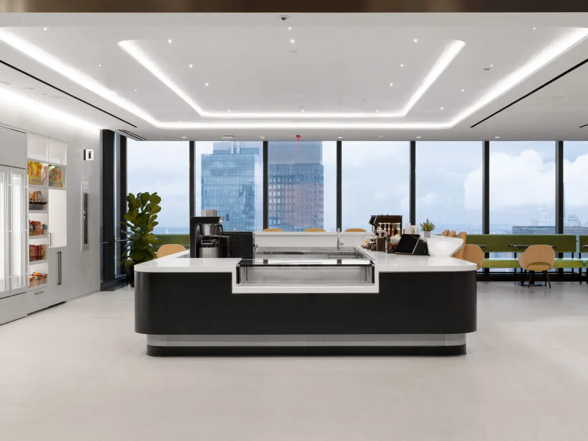 Freshfields Bruckhaus Deringer’s new 180,000 SF office at 3 World Trade Center spans four floors and reflects a modern evolution in legal workplace design. The space balances transparency and privacy with glass-front private offices, state-of-the-art acoustic wall systems, and light-filled interiors that maximize views of the Brooklyn Bridge and Lower Manhattan skyline. Designed to foster collaboration and connection, the office features hub pantries on each floor, a full-service café with Grab & Go and barista station, and multiple breakout and meeting spaces. Three architecturally striking interconnecting staircases clad in decorative precast concrete with wood handrails and glass guardrails anchor the workplace, creating dramatic focal points and enhancing movement between floors. High-end finishes, including poured Laticrete NXT concrete flooring, acoustical wall fabric panels, and stone and ceramic tile throughout, contribute to a refined, amenity-rich environment tailored to the needs of today’s legal professionals.