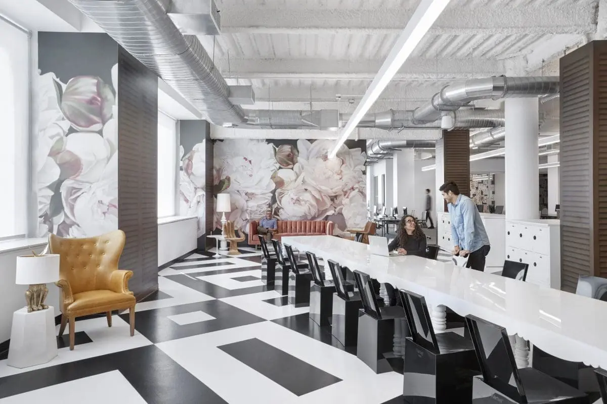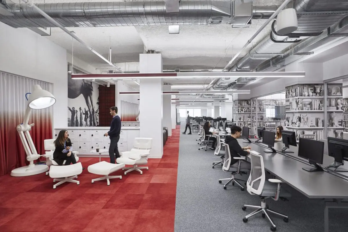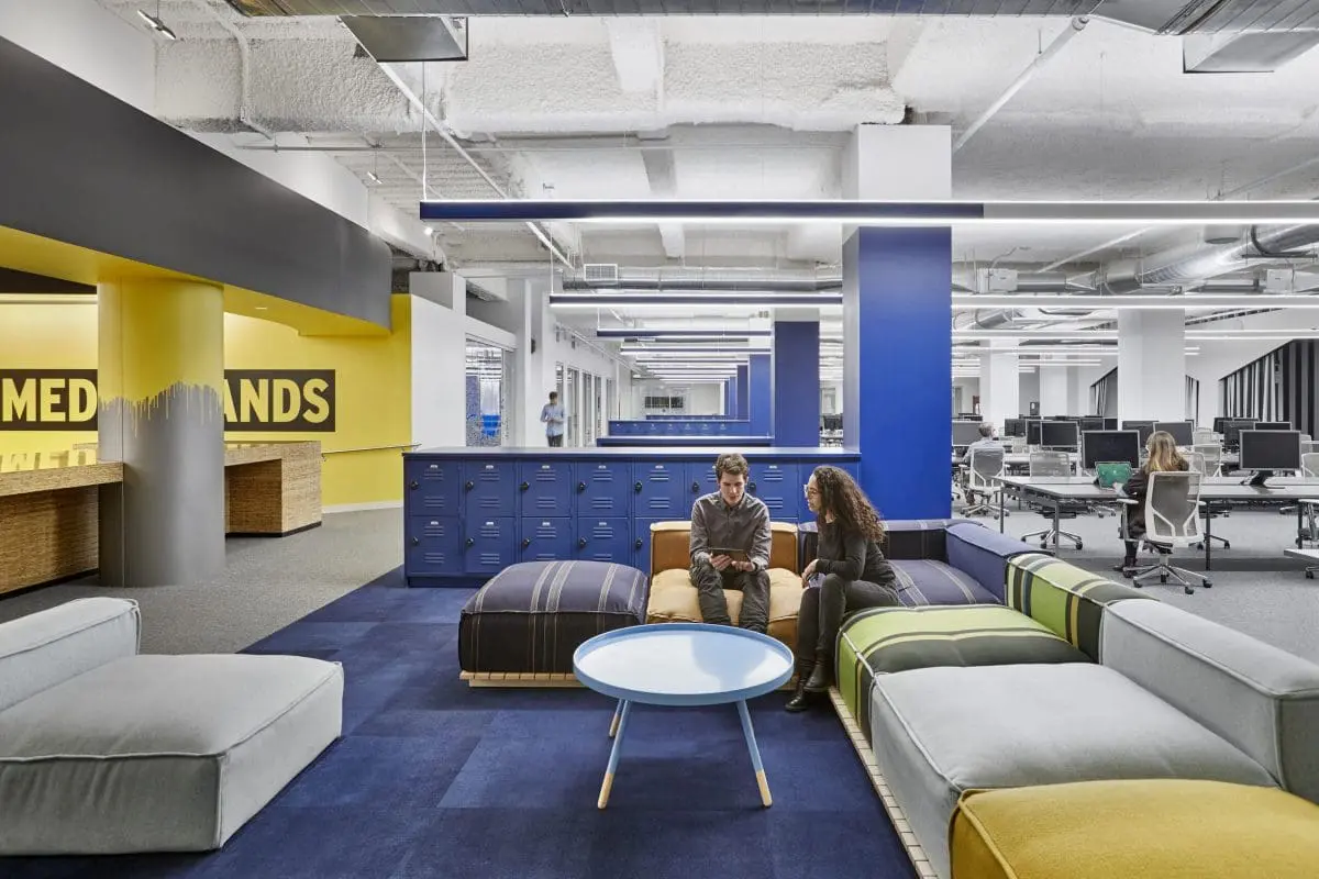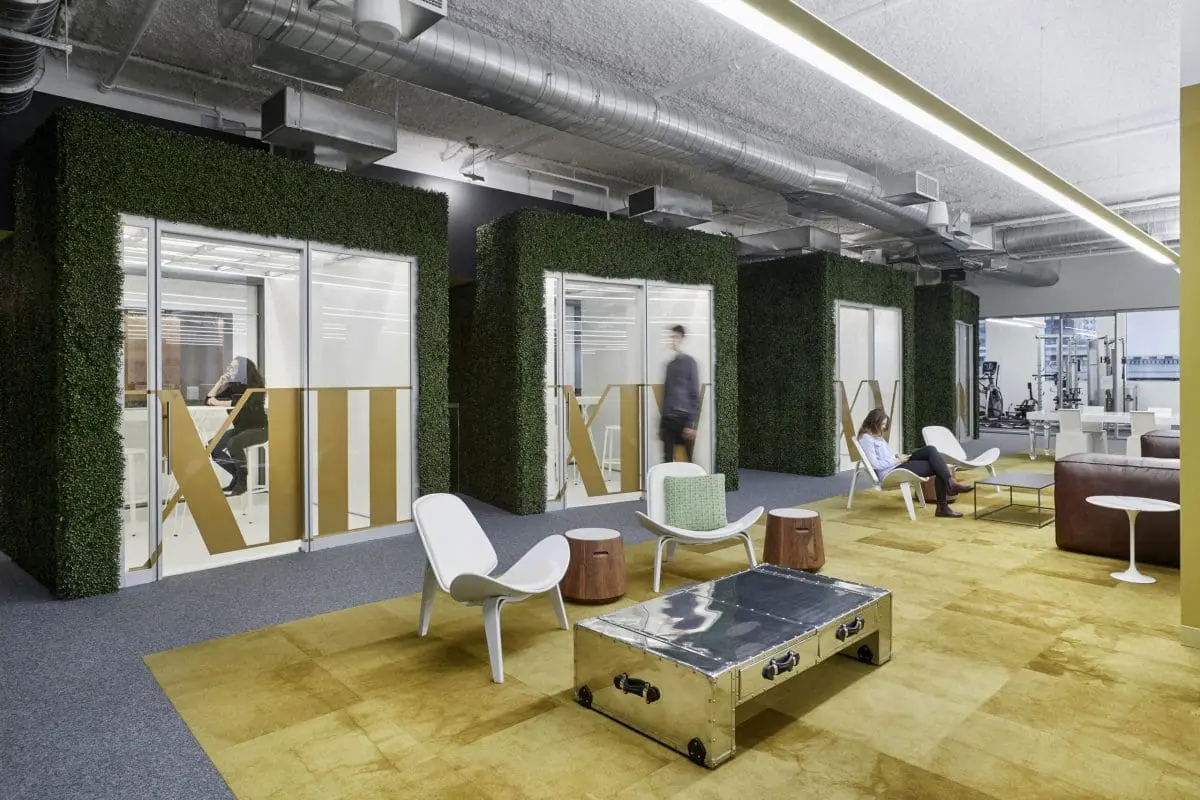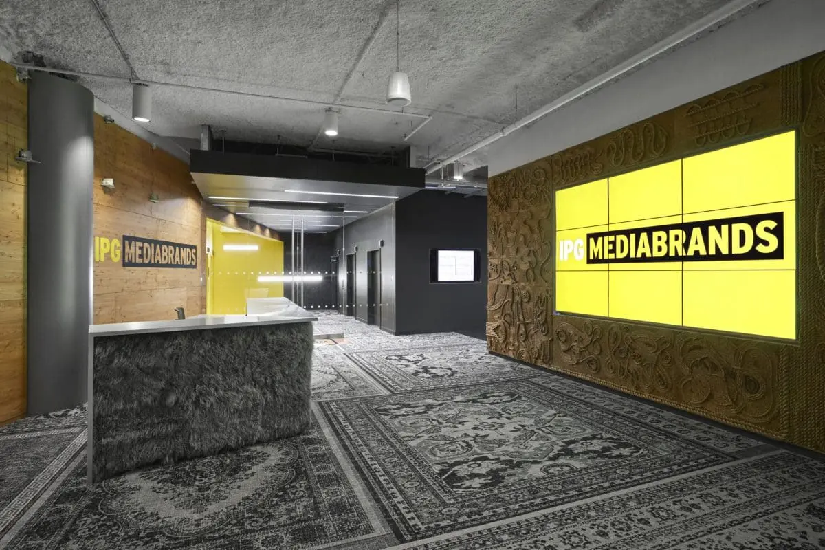 The creative two-floor office space is separated into “neighborhoods” using color blocking. Bold patterns and varied textures on the walls reflect the reflect the brands’ dynamic culture. Phone rooms along the perimeter offer privacy, and strategically placed lockers indicate a flexible workspace with no assigned desks. The vibrant reception area seamlessly connects to the elevator lobby, featuring a large LED screen displaying company content.