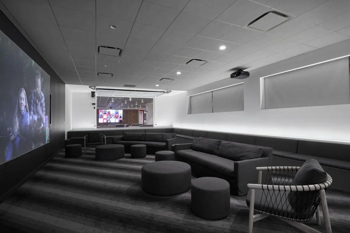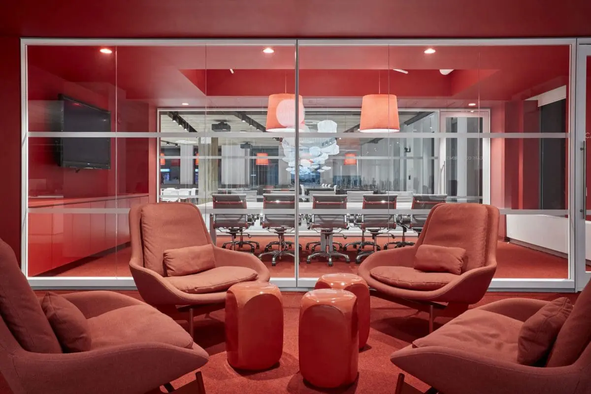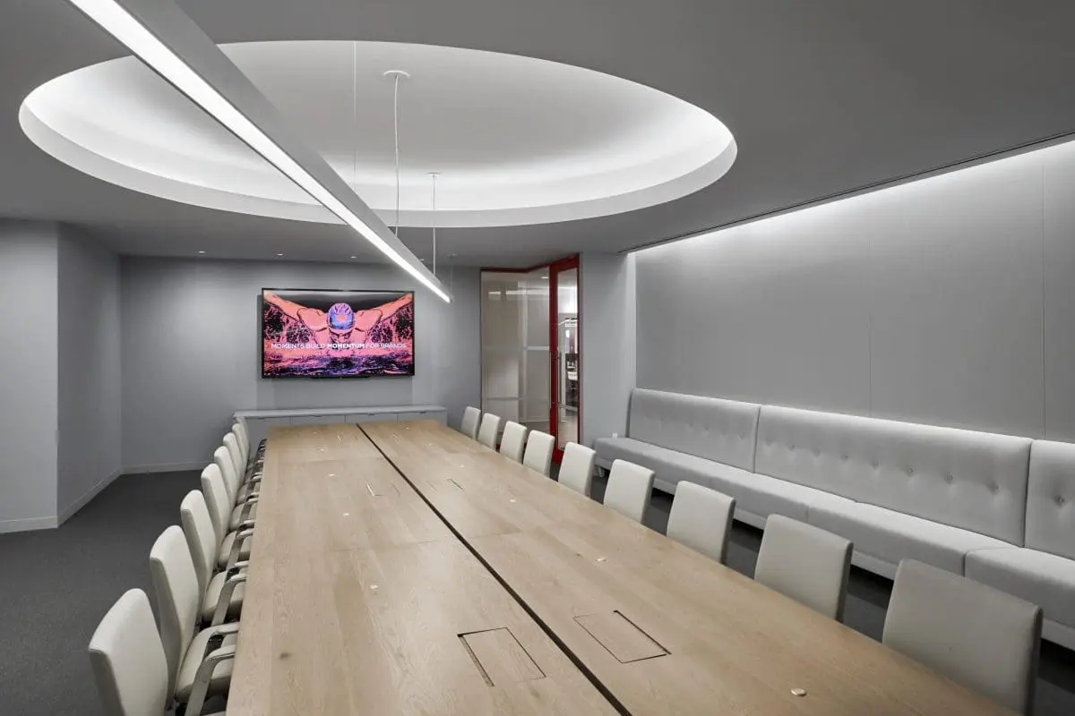 The award-winning project was our second with Ted Moudis Architects and the IPG Mediabrands client. The space showcases a sophisticated design with bold colors, custom ceilings and lighting, and a unique speakeasy.  Enhancing functionality, the space includes a generously sized pantry area with custom millwork, providing both practicality and aesthetic appeal.