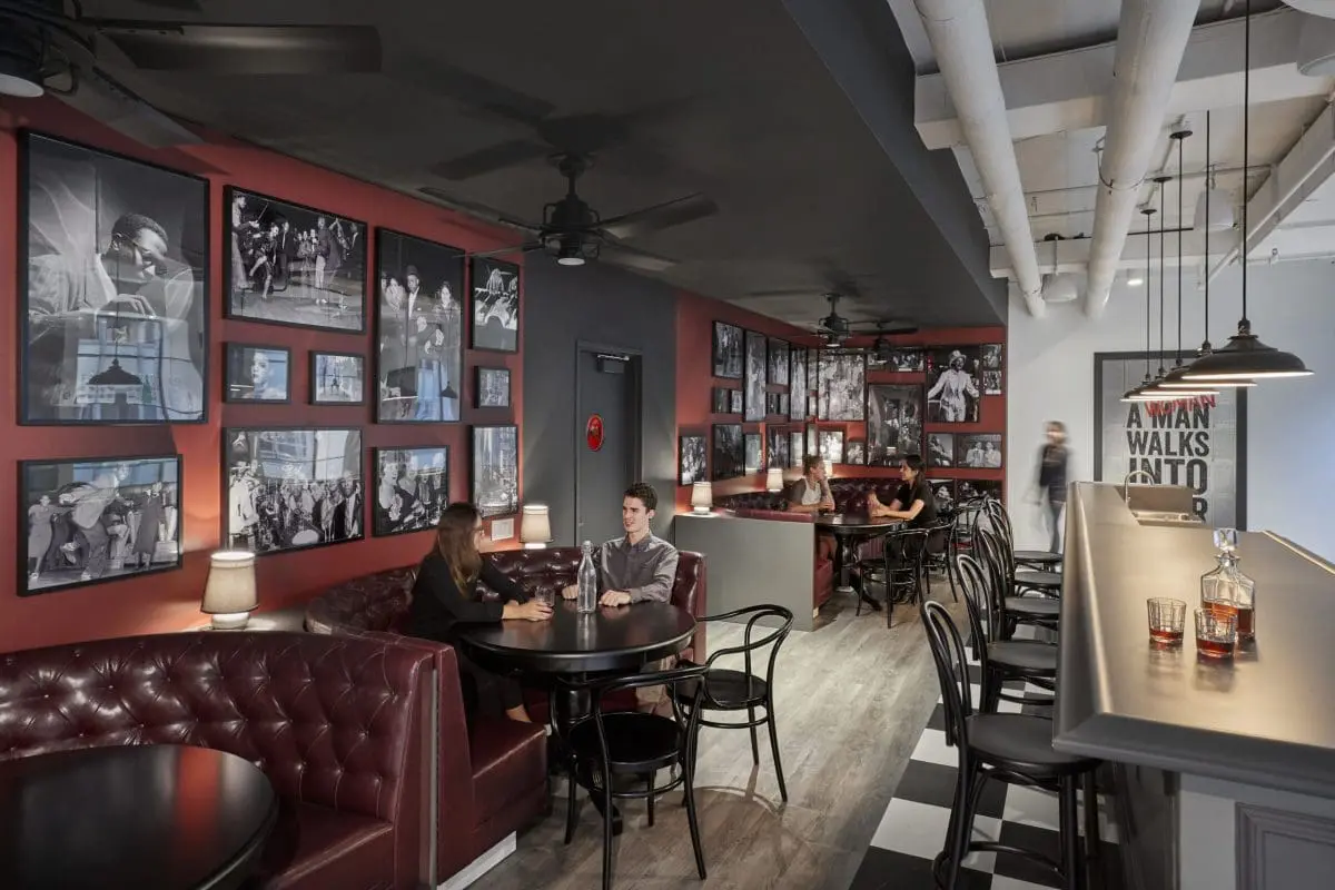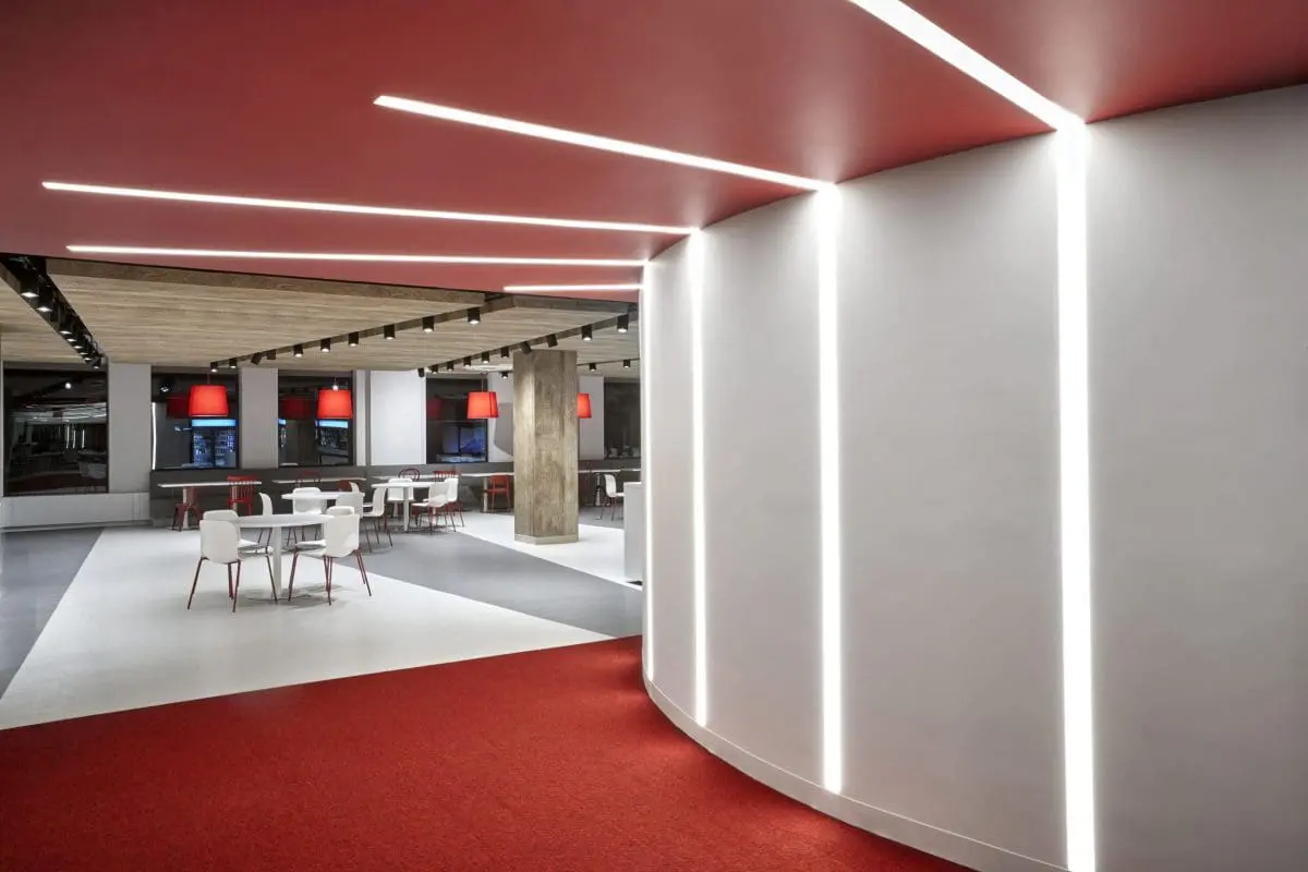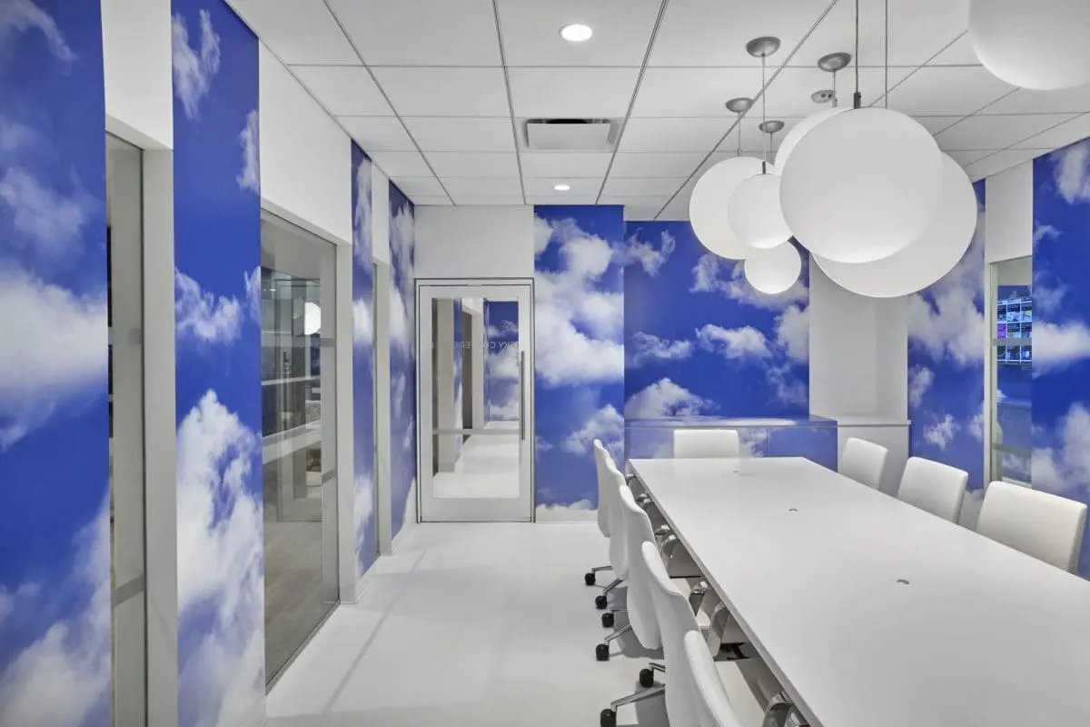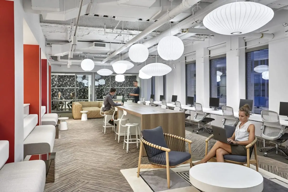 The award-winning project was our second with Ted Moudis Architects and the IPG Mediabrands client. The space showcases a sophisticated design with bold colors, custom ceilings and lighting, and a unique speakeasy.  Enhancing functionality, the space includes a generously sized pantry area with custom millwork, providing both practicality and aesthetic appeal.