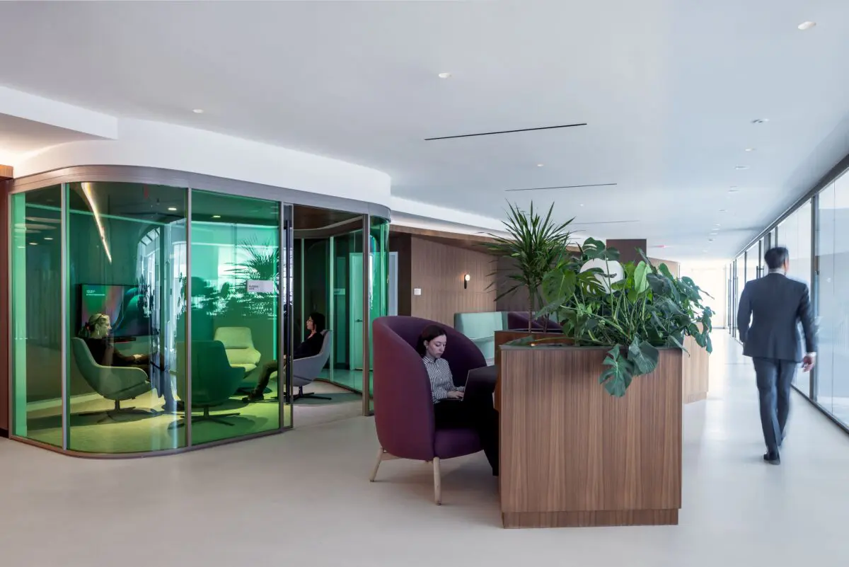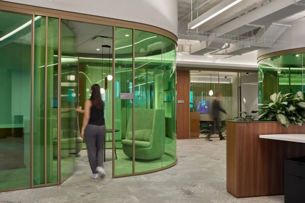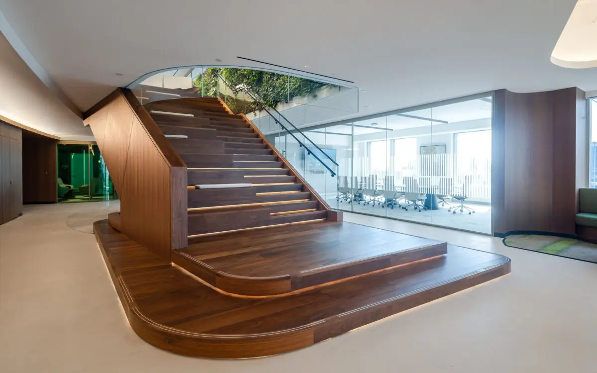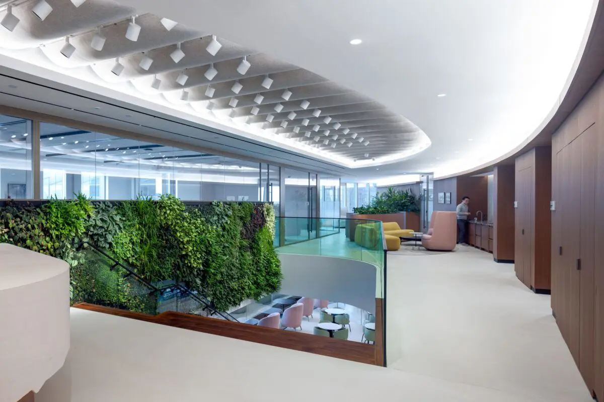 This project for global enterprise Mitsubishi Corporation spans 68,500 square feet across two floors of luxury office space. LEED Gold Certified, the space features high-end finishes, including intricate millwork and curved, tinted glass-front offices throughout. An impressive interconnecting staircase, highlighted by a green living wall, connects the two floors and serves as the focal point of the space. The office includes meeting rooms, huddle rooms, a café, a reception area, and private offices, all meticulously crafted to create a sophisticated and functional workspace for Mitsubishi.