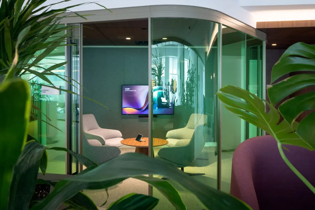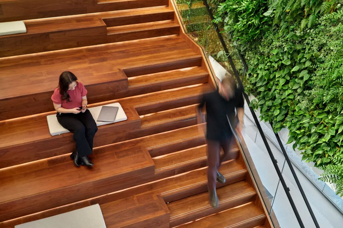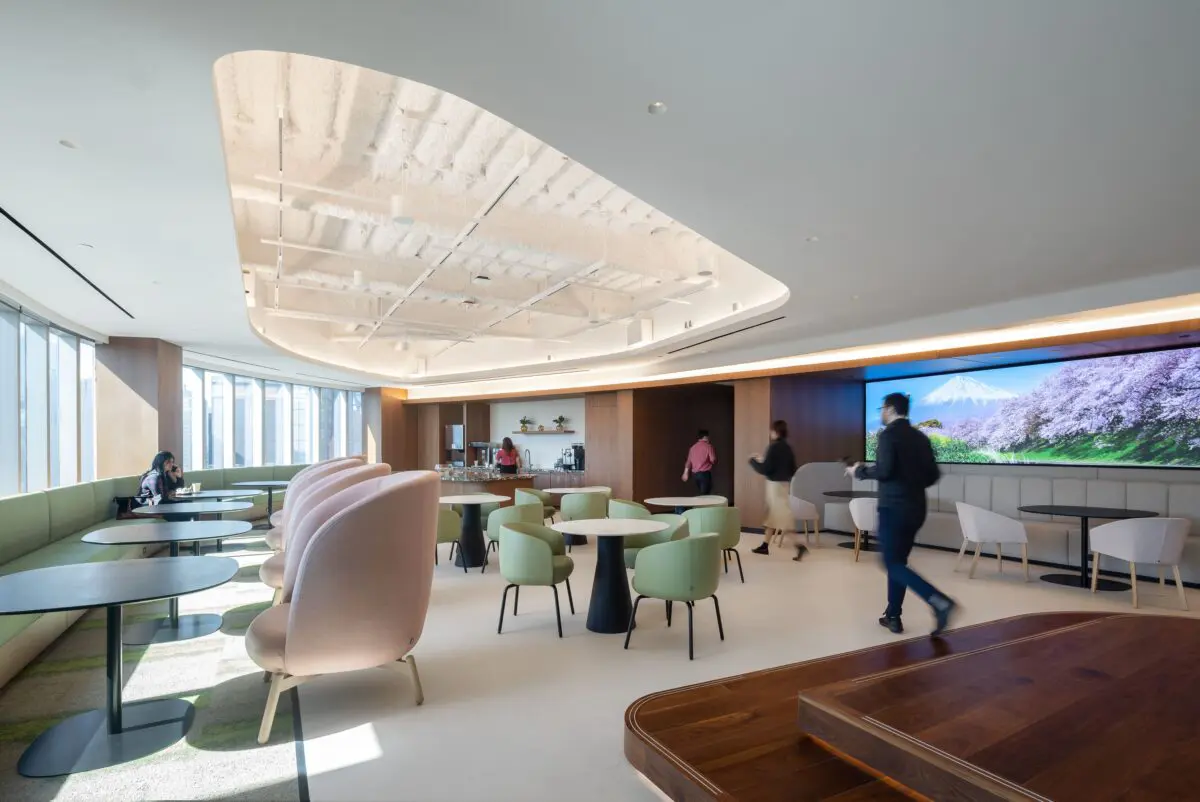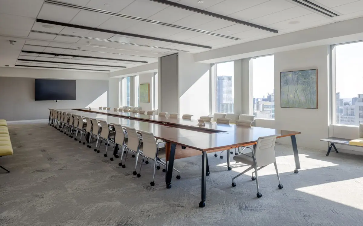 This project for global enterprise Mitsubishi Corporation spans 68,500 square feet across two floors of luxury office space. LEED Gold Certified, the space features high-end finishes, including intricate millwork and curved, tinted glass-front offices throughout. An impressive interconnecting staircase, highlighted by a green living wall, connects the two floors and serves as the focal point of the space. The office includes meeting rooms, huddle rooms, a café, a reception area, and private offices, all meticulously crafted to create a sophisticated and functional workspace for Mitsubishi.
