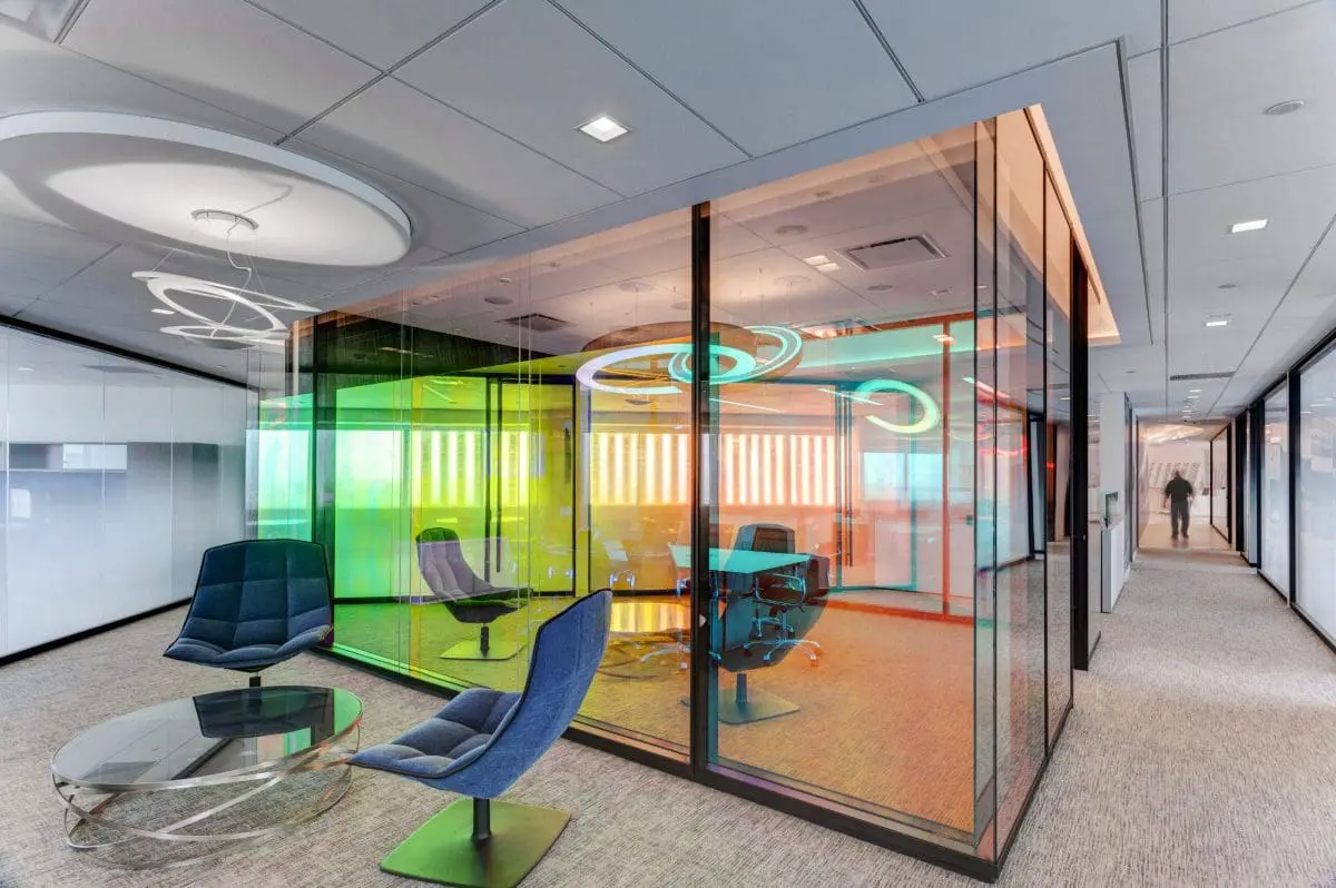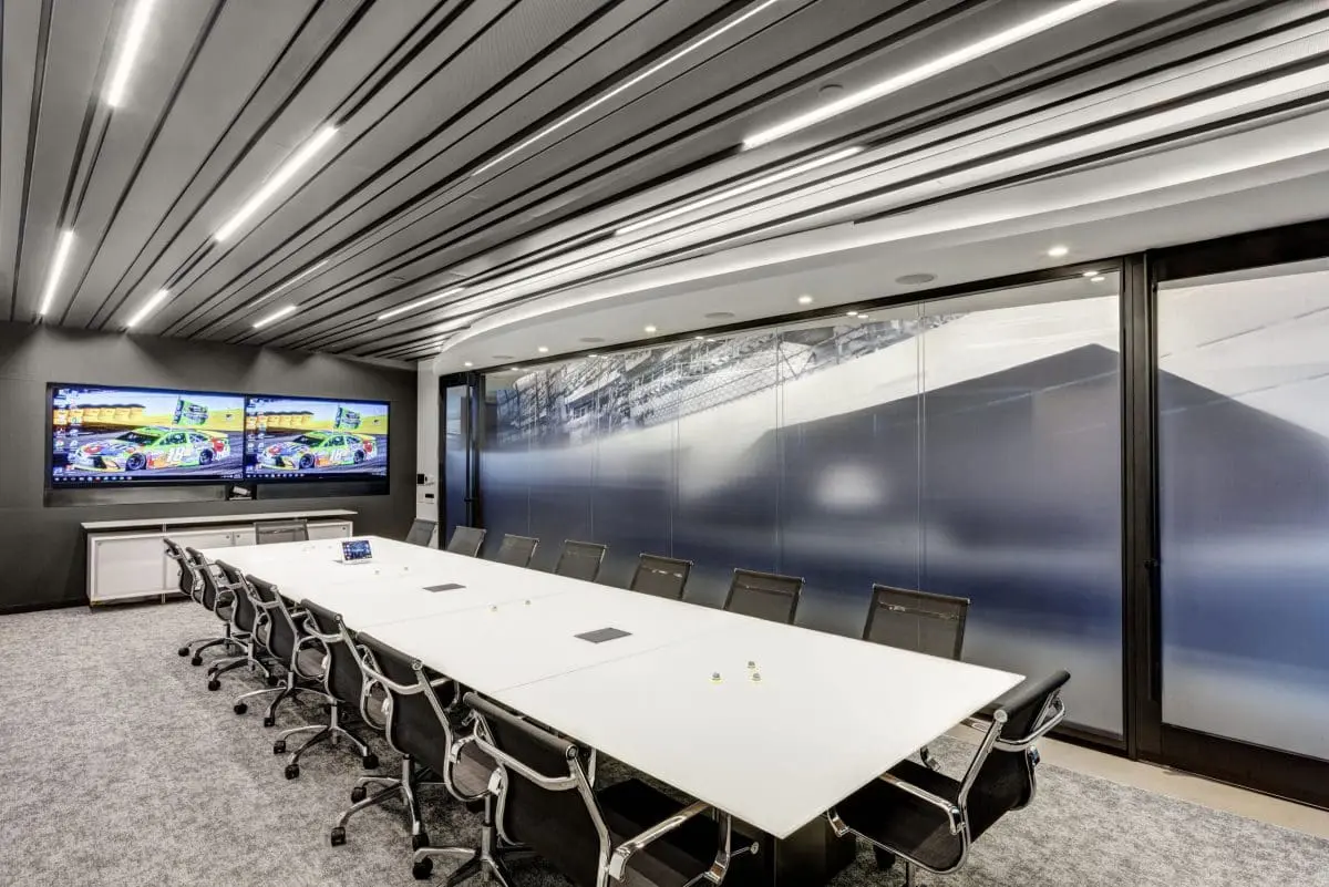 NASCAR’s new office showcases open-plan workspaces, private glassed-in offices with Central Park views, and conference rooms named after famous racecar drivers. Designed to embody NASCAR’s identity, the space features a racetrack-inspired ceiling in the reception area, with metal inlays in the floor. Highlights include a custom reception desk, dynamic light fixtures, and large video screens streaming races at the entryway.