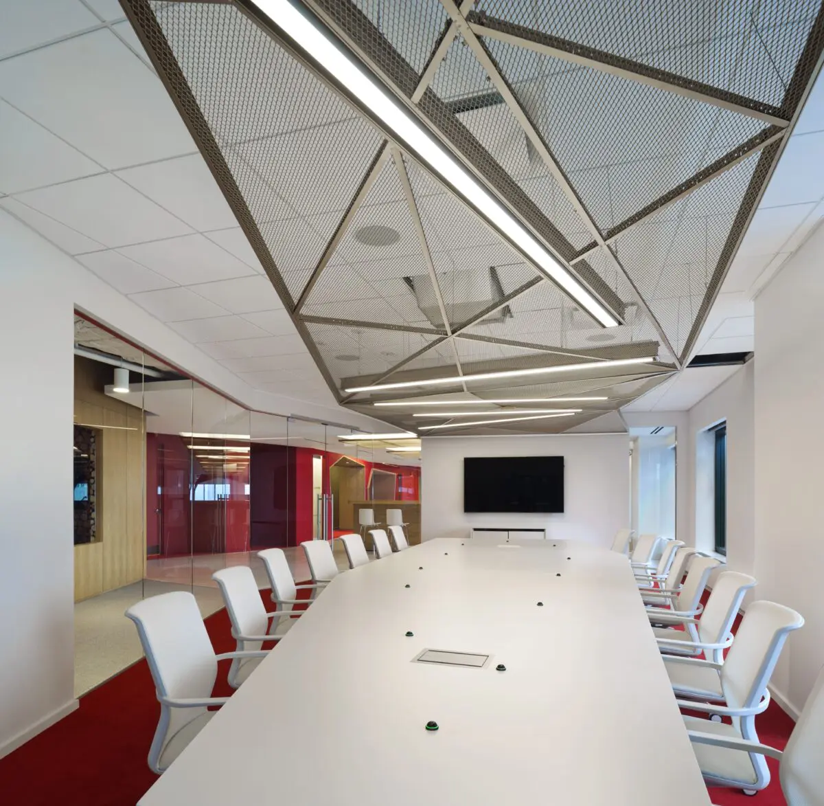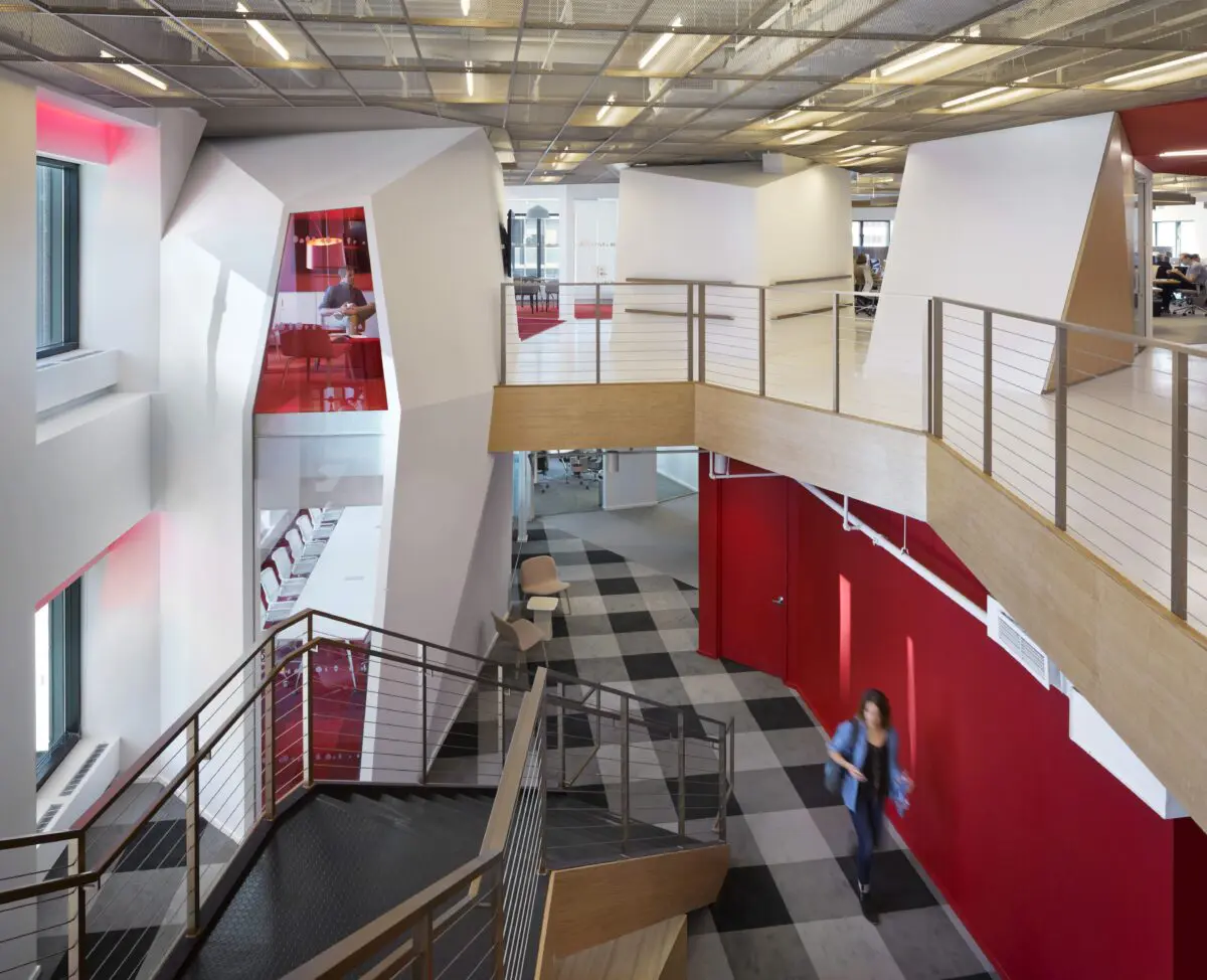 This office fit-out combines three existing floors with five new ones. Fostering an open and collaborative environment for 1,200 employees, the space was designed without assigned desks or perimeter offices and features unobstructed windows framing breathtaking views. A grand stair connects three middle levels, facilitating movement across the expansive atrium. Meeting and conference rooms are strategically placed throughout.