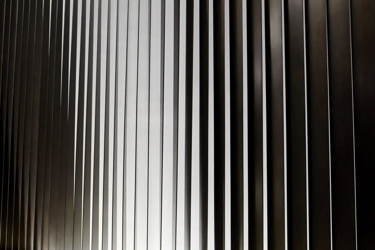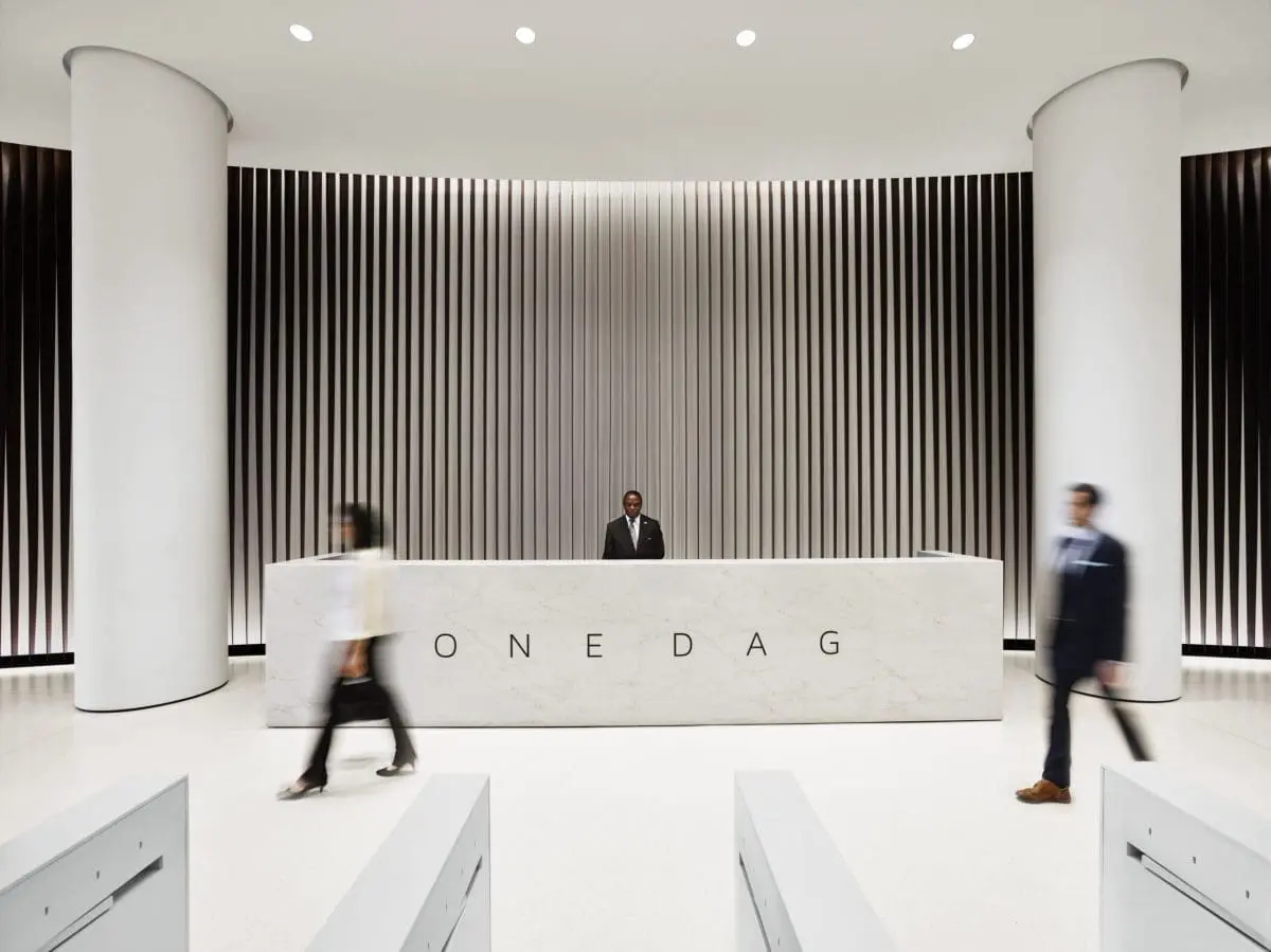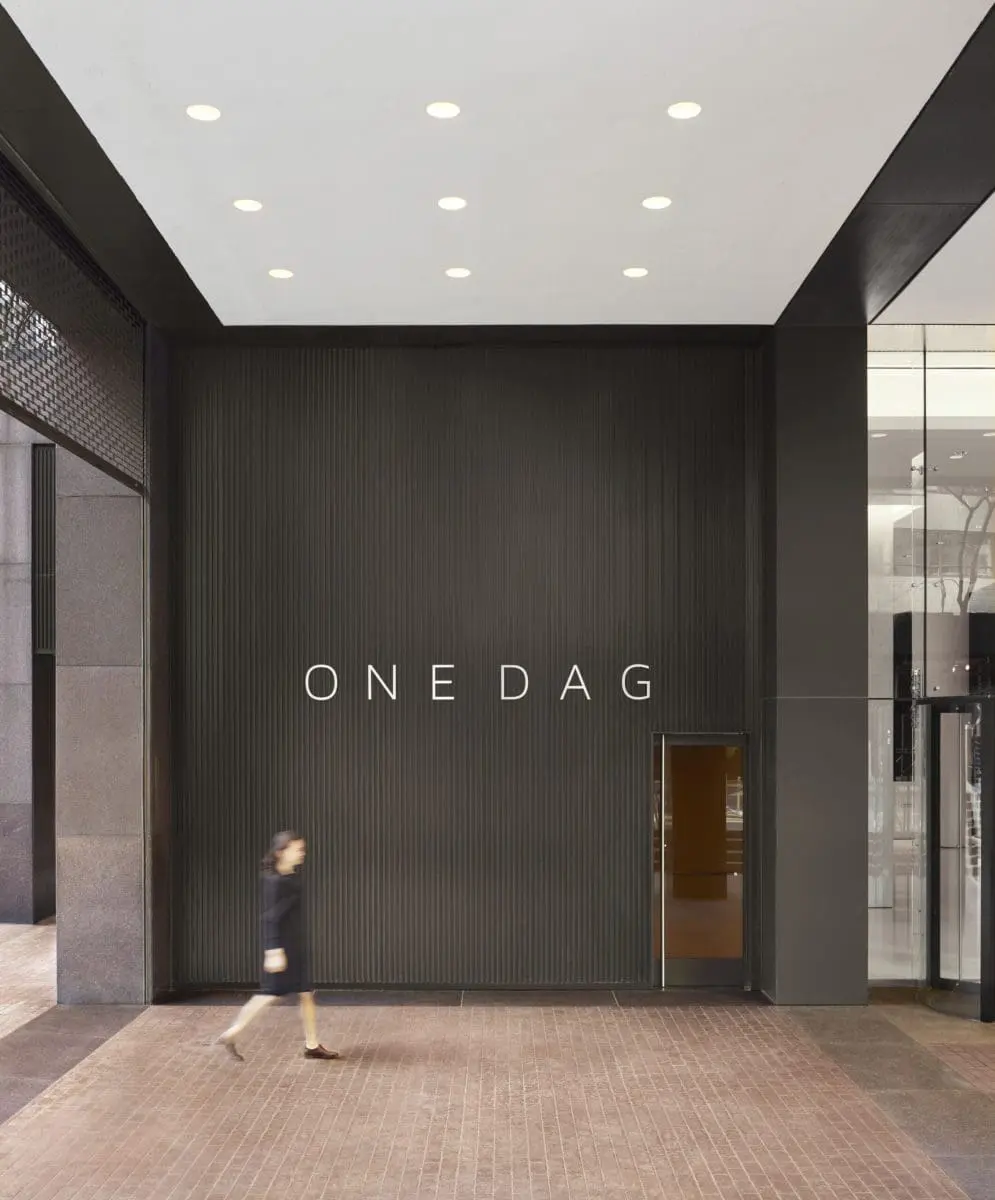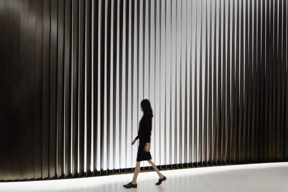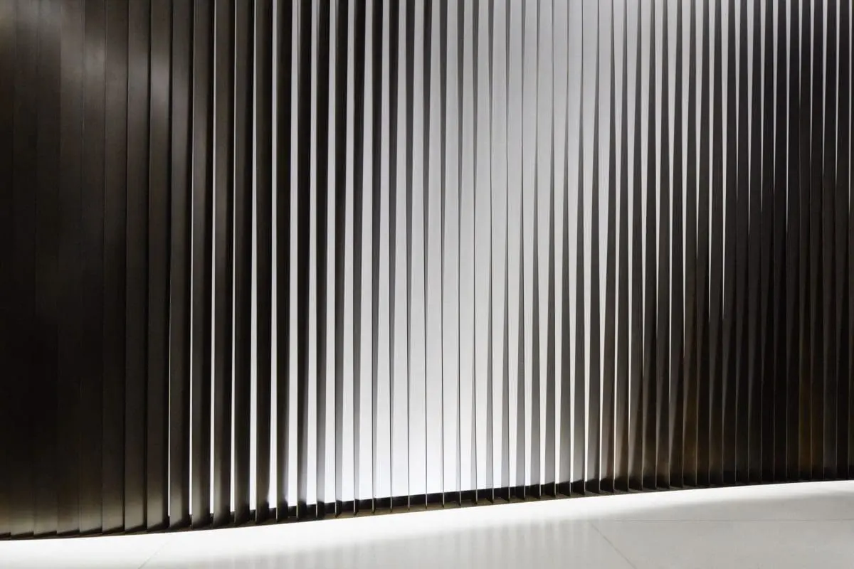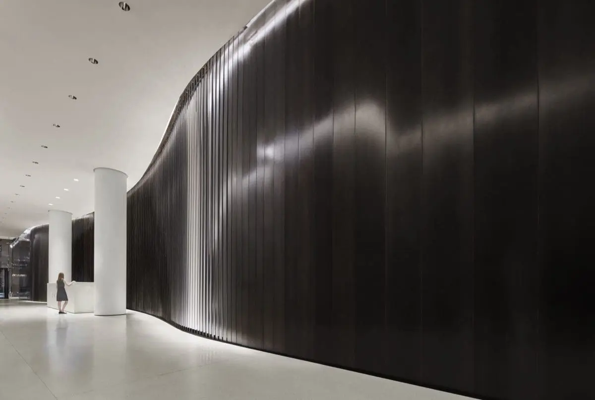 At each entry, a bronze, solid-panel wall defines the edges and it then slowly dematerializes toward the center of the lobby. As the wall opens up, it translates into a series of individually twisted fins, resulting in a dramatic, rhythmic experience and a visual moire effect.