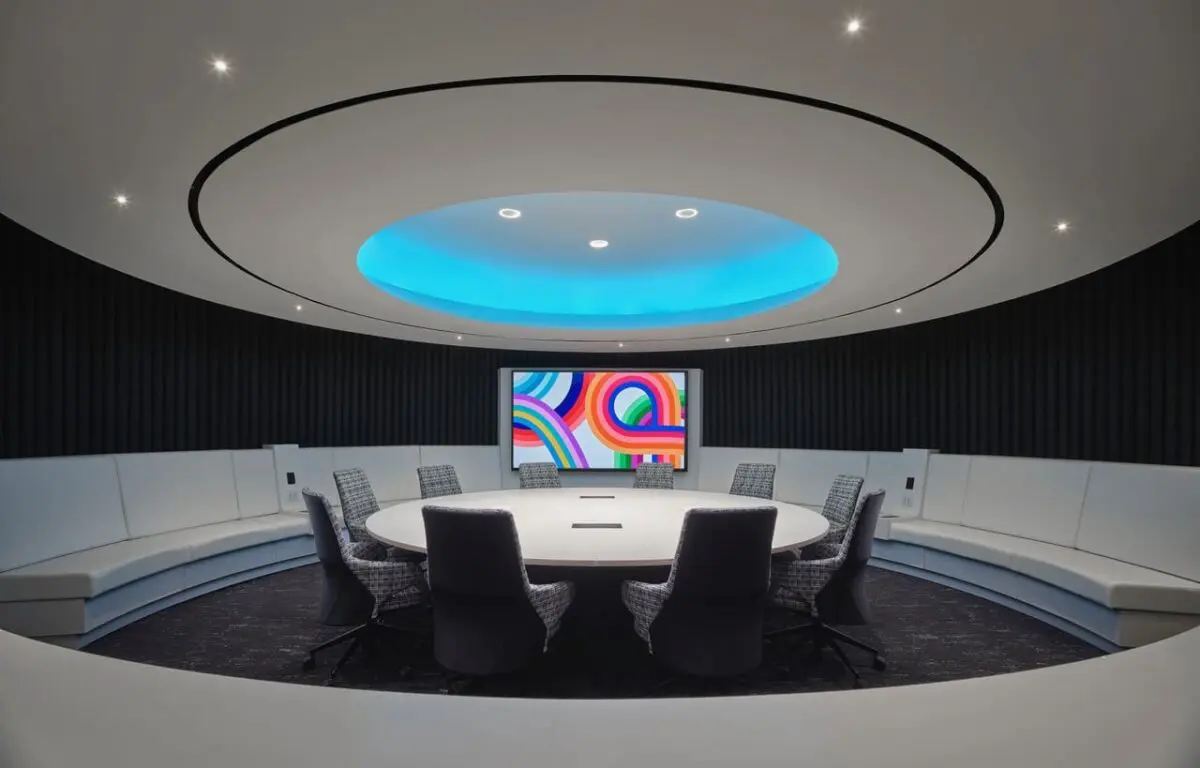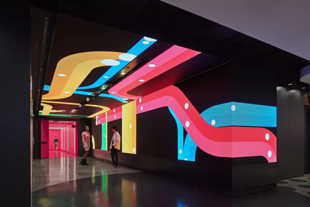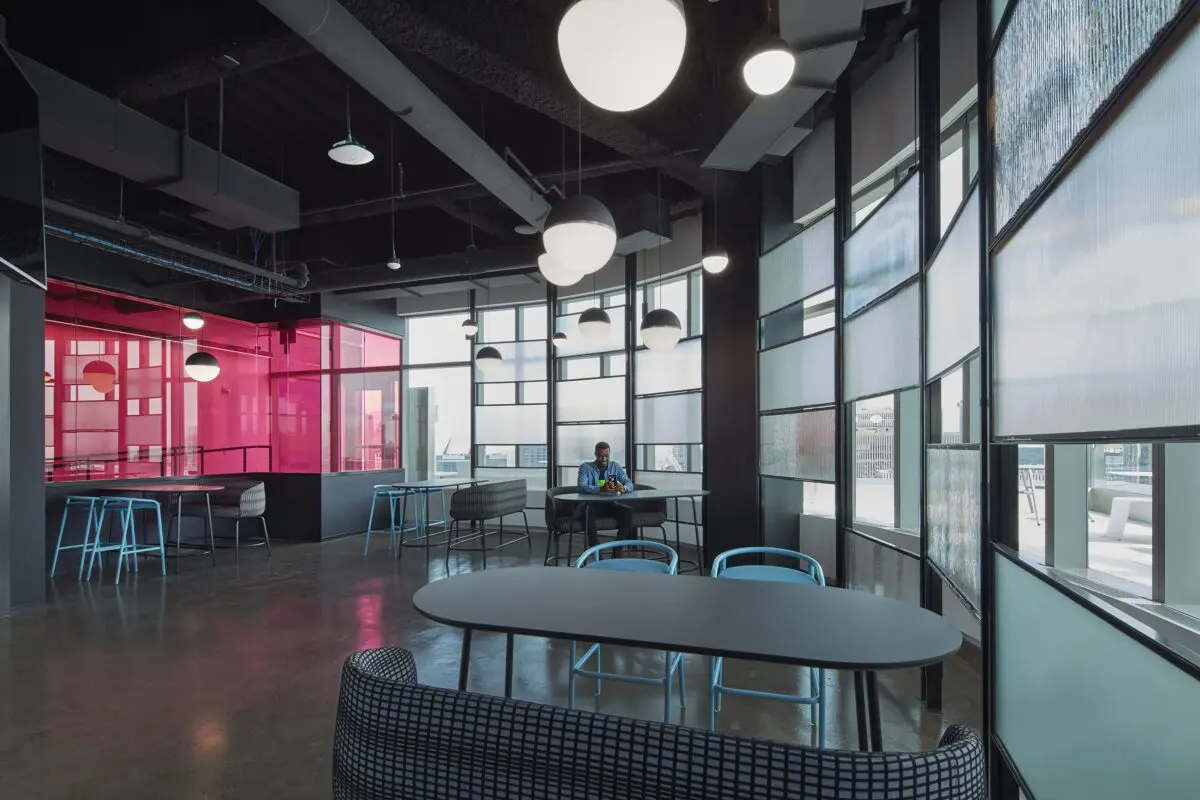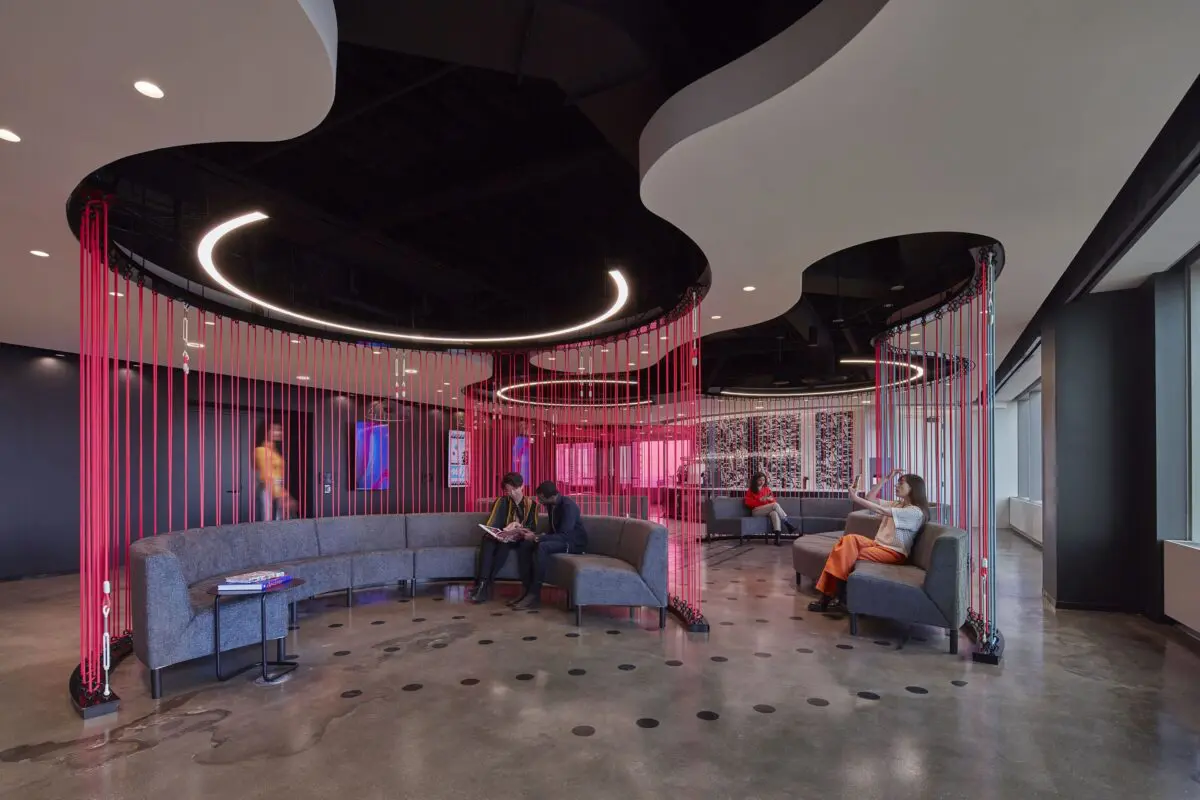 In the top 5 floors at 4 Times Square, TikTok’s NYC headquarters showcases recording studios, private offices, meeting rooms and training spaces throughout the space. The new office boasts a stunning atrium staircase, massive LED screens, and cutting-edge technology, setting a new standard for contemporary workspaces.