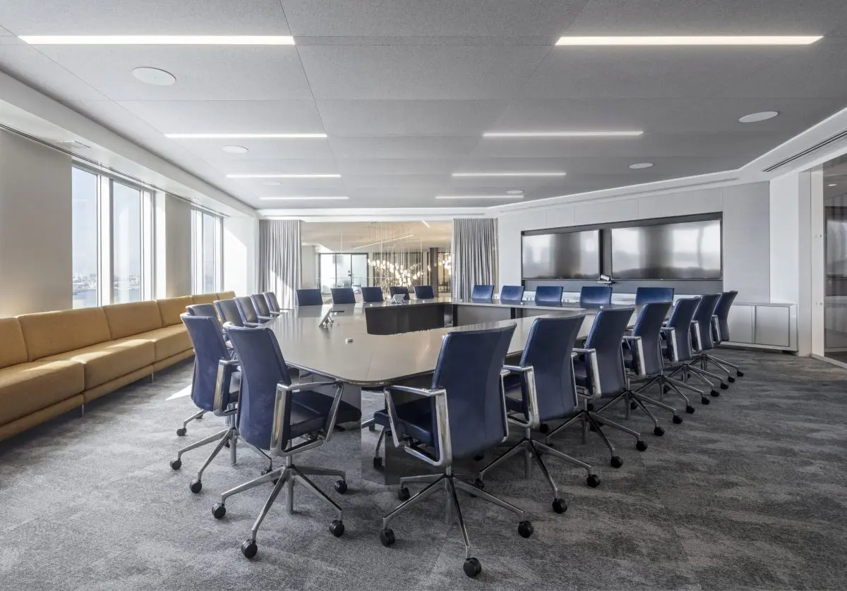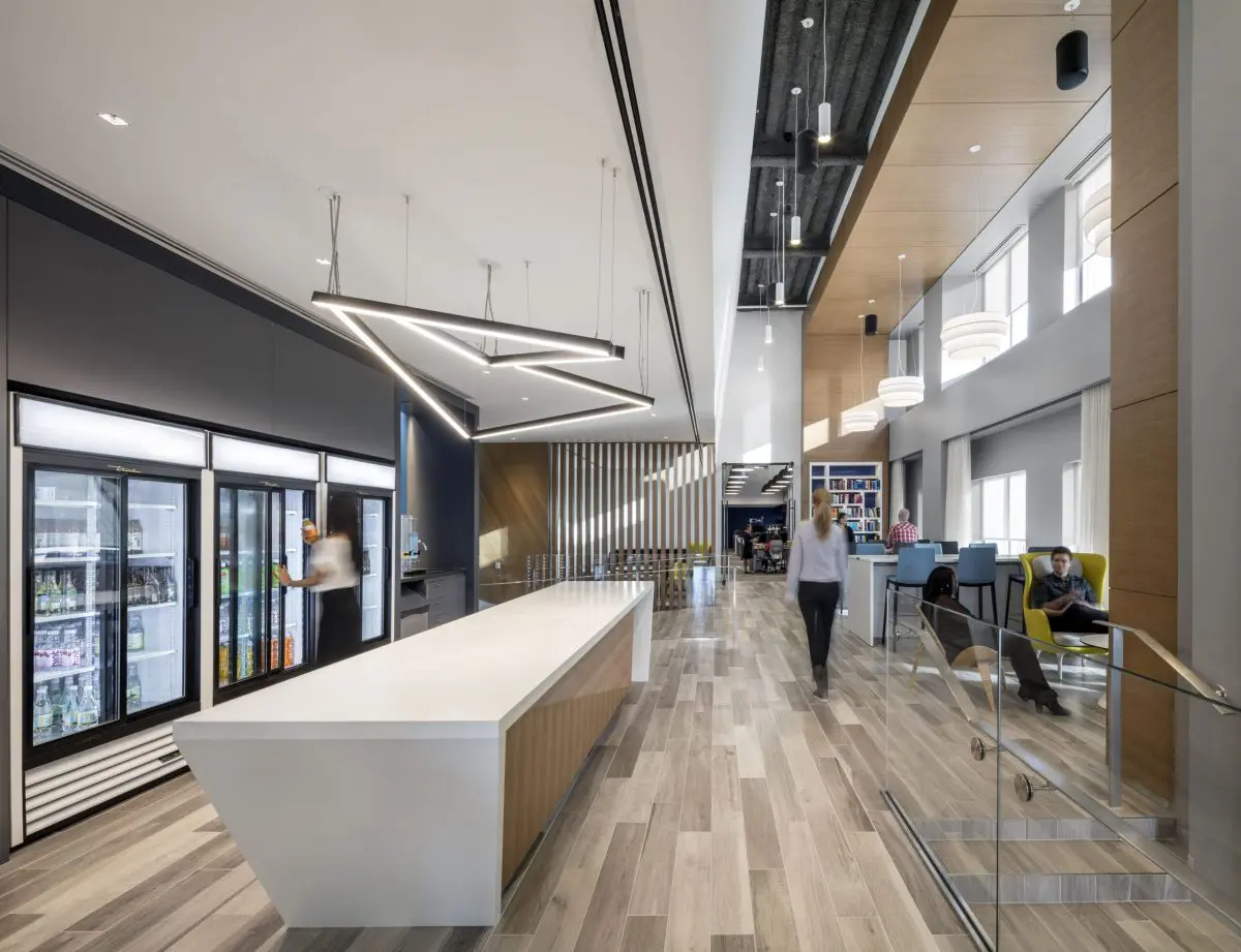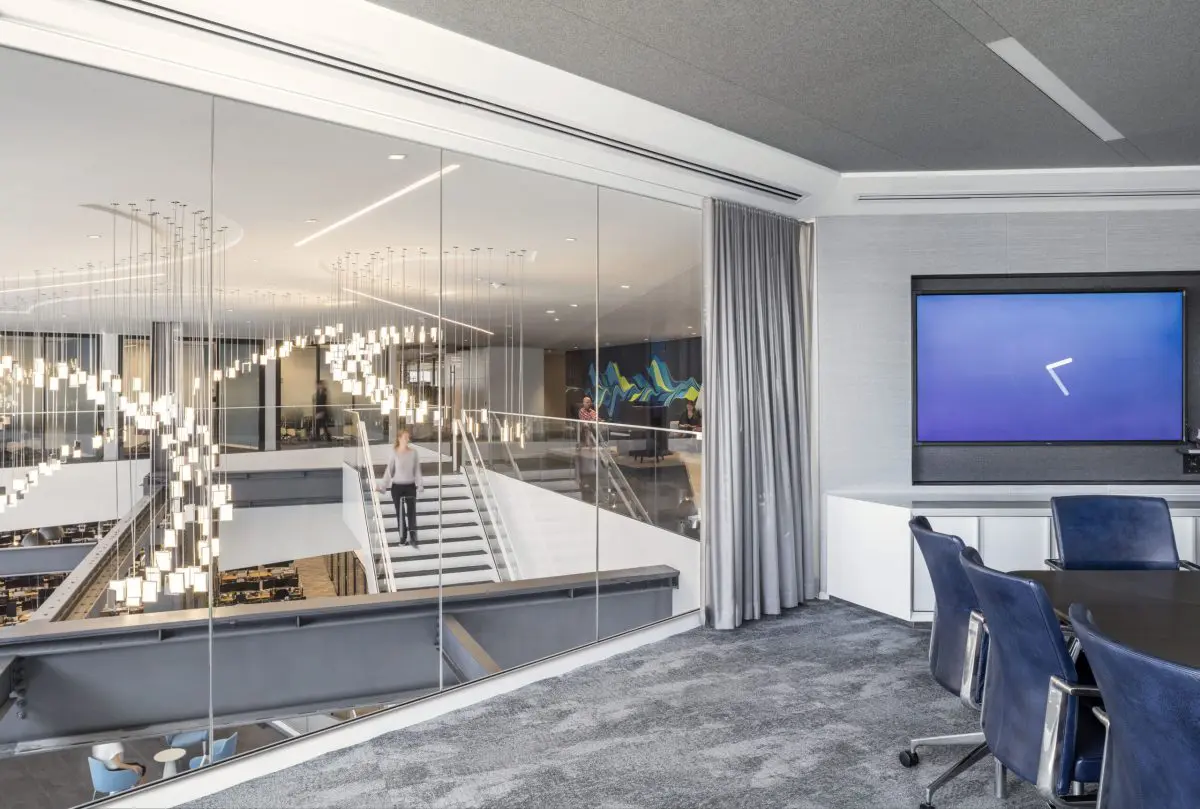 This 160,000 SF space features a state-of-the-art trading floor, flexible collaboration spaces, and a striking feature staircase. Custom lighting and bespoke millwork add a touch of sophistication to the office. Prioritizing employee well-being, this project has received a WELL Gold certification, boasting advanced air and water filtration systems throughout the floors.