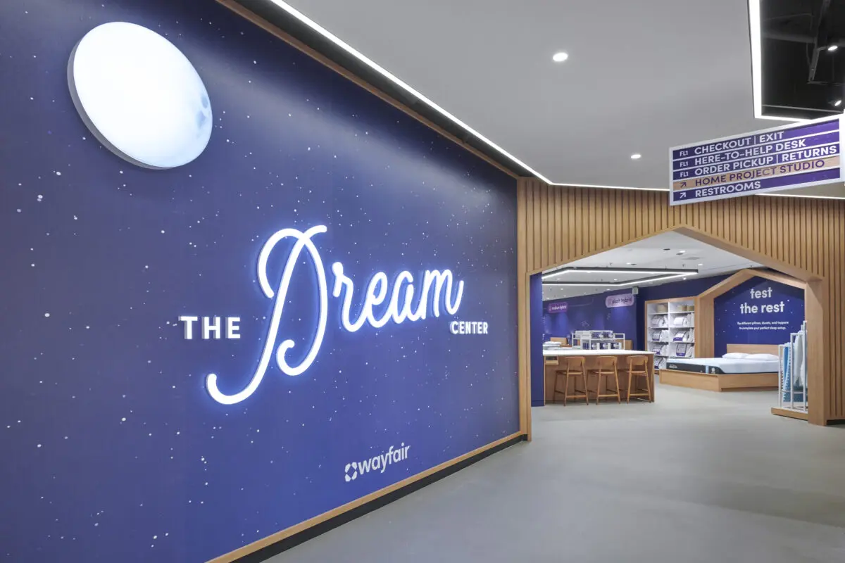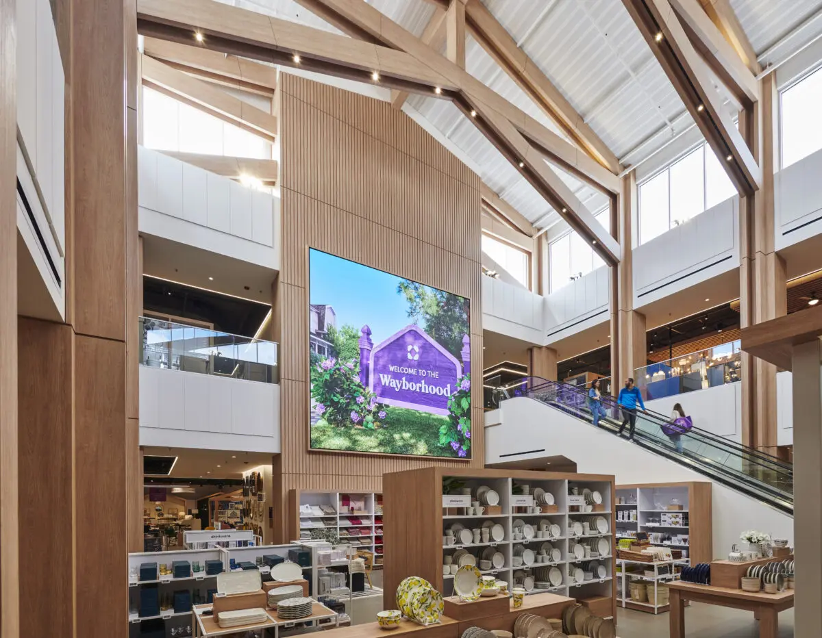 This project consisted of a full gut renovation of a 164,000-SF building alongside a 110,000-SF exterior extension, revitalizing it into a bustling store for retail giant, Wayfair. Construction included new facades, roofs, vertical transportation, utilities, and interior, while the expansion introduced a plaza, parking area, landscaping, and storm detention center. The brand-new store hosts The Porch at Wayfair – a full-service café providing both indoor and outdoor seating – as well as interactive experiences like the “Dream Center” and a Design Studio. Extensive structural enhancements enabled the creation of a striking three-story glass atrium, featuring a millwork-adorned wall and a 20’ x 20’ display screen. Outside, the distinctive façade boasts terracotta rainscreen panels in the brand’s signature purple, ACM-clad canopies, and a captivating 70’ x 40’ backlit metal panel feature wall at the main entrance, accentuating Wayfair’s unique aesthetic.